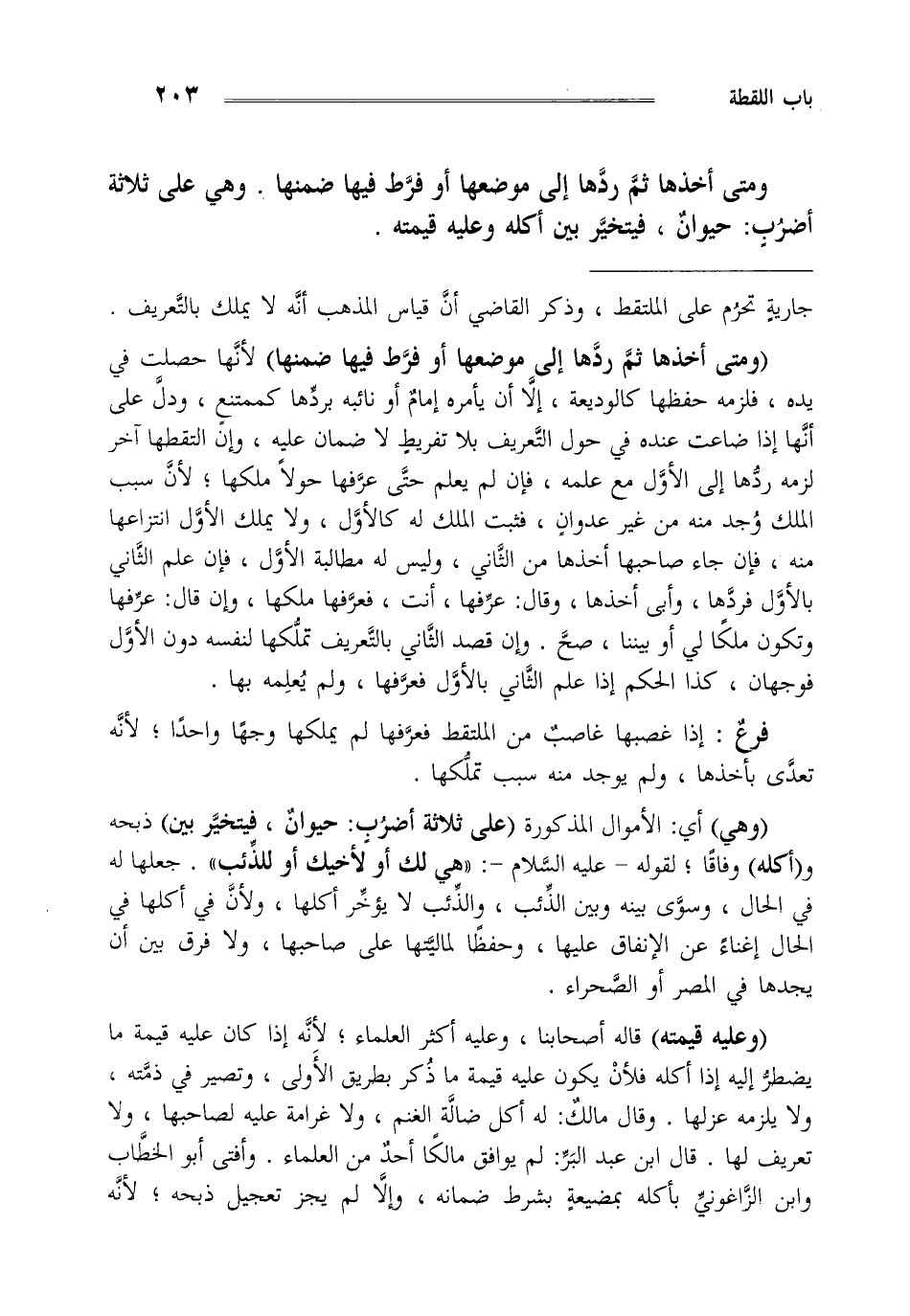 "وهي" أي الأموال المذكورة "على ثلاثة أضرب حيوان فيتخير بين" ذبحه و"أكله" وفاقا لقوله عليه السلام "هي لك أو لأخيك أو للذئب" جعلها له في الحال وسوى بينه وبين الذئب والذئب لا يؤخر أكلها ولأن في أكلها في الحال إغناء عن الإنفاق عليها وحفظا لماليتها على صاحبها ولا فرق بين أن يجدها في المصر أو الصحراء.