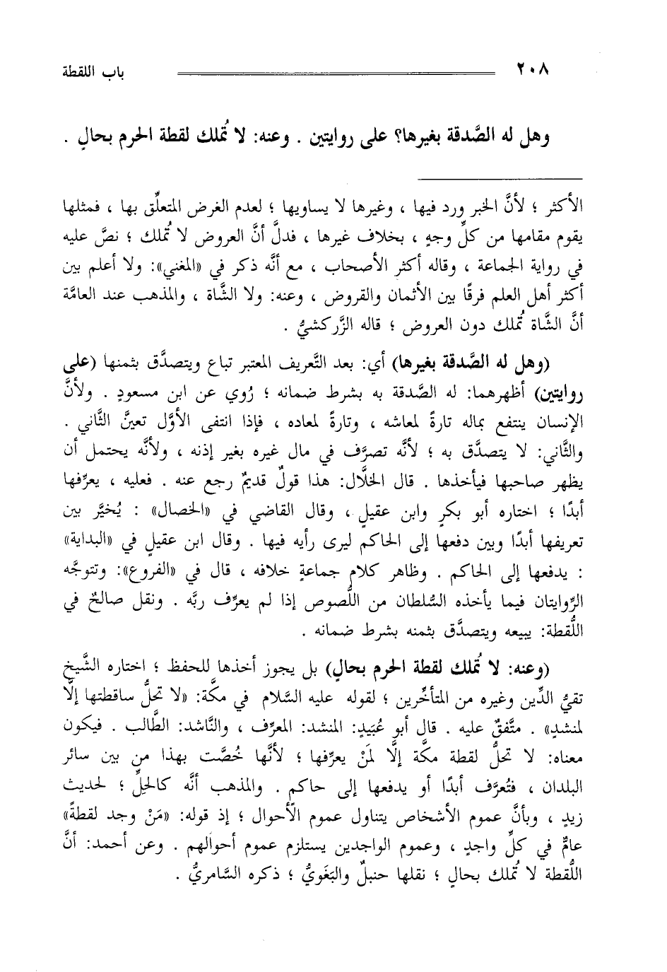وهل له الصدقة بغيرها على روايتين وعنه لاتملك لقطة الحرم بحال