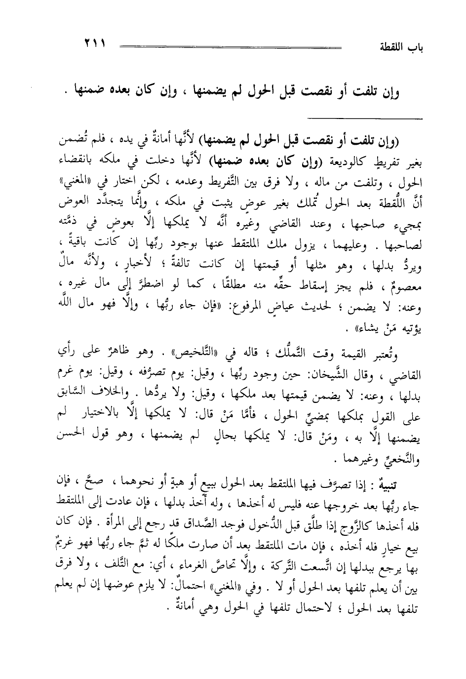 "وإن تلفت أو نقصت قبل الحول لم يضمنها" لأنها أمانة في يده فلم تضمن بغير تفريط كالوديعة "وإن كان بعده ضمنها" لأنها دخلت في ملكه بانقضاء الحول وتلفت من ماله ولا فرق بين التفريط وعدمه لكن اختار في المغني أن اللقطة بعد الحول تملك بغير عوض يثبت في ملكه وإنما يتجدد العوض بمجيء صاحبها وعند القاضي وغيره أنه لا يملكها إلا بعوض في ذمته لصاحبها وعليهما يزول ملك الملتقط عنها بوجود ربها إن كانت باقية ويرد بدلها وهو مثلها أو قيمتها إن كانت تالفة لأخبار ولأنه مال معصوم فلم يخبر إسقاط حقه منه مطلقا كما لو اضطر إلى مال غيره وعنه لا يضمن لحديث عياض المرفوع "فإن جاء ربها وإلا فهو مال الله يؤتيه من يشاء" .