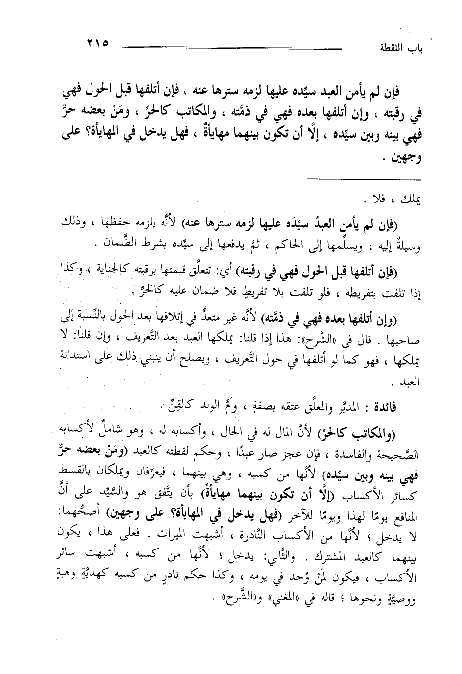 "والمكاتب كالحر" لأن المال له في الحال وأكسابه له وهو شامل لأكسابه الصحيحة والفاسدة فإن عجز صار عبدا وحكم لقطته كالعبد "ومن بعضه حر فهي بينه وبين سيده" لأنها من كسبه وهي بينهما فيعرفان ويملكان بالقسط كسائر الاكساب "إلا أن تكون بينهما مهايأة" بأن يتفق هو والسيد على أن المنافع يوما لهذا ويوما للآخر "فهل يدخل في المهايأة على وجهين" أصحهما لا يدخل لأنها من الاكساب النادرة أشبهت الميراث فعلى هذا يكون بينهما كالعبد المشترك والثاني يدخل لأنها من كسبه أشبهت سائر الأكساب فيكون لمن وجد في يومه وكذا حكم نادر من كسبه كهدية وهبة ووصية ونحوها قاله في المغني والشرح