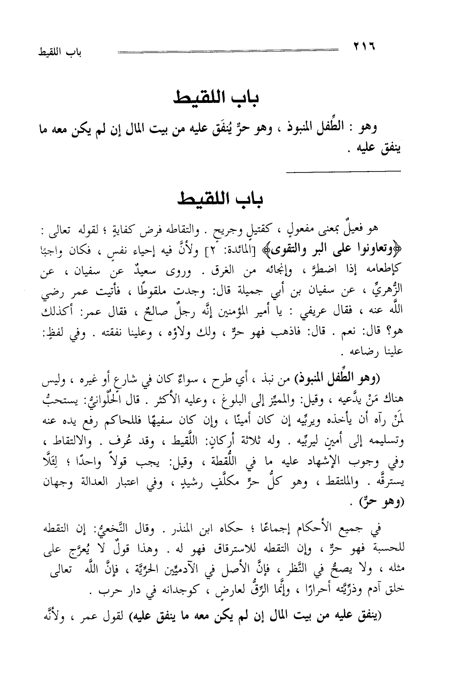 هو فعيل بمعنى مفعول كقتيل وجريح والتقاطه فرض كفاية لقوله تعالى {وَتَعَاوَنُوا عَلَى الْبِرِّ وَالتَّقْوَى} (المائدة: من الآية2) ولأن فيه إحياء نفس فكان واجبا كإطعامه إذا اضطر وإنجائه من الغرق وروى سعيد عن سفيان عن الزهري عن سنين أبي جميلة قال وجدت ملقوطا فأتيت عمر رضي الله عنه فقال عريفي يا أمير المؤمنين أنه رجل صالح فقال عمر أكذلك هو قال نعم قال فاذهب فهو حر ولك ولاؤه وعلينا نفقته وفي لفظ علينا رضاعه "وهوالطفل المنبوذ" من نبذ أي طرح سواء كان في شارع أو غيره وليس هناك من يدعيه وقيل والمميز إلى البلوغ وعليه الاكثر قال الحلواني يستحب لمن رآه أن يأخذه ويربيه إن كان أمينا وإن كان سفيها فللحاكم رفع يده عنه وتسليمه إلي أمين ليربيه وله ثلاثة أركان اللقيط وقد عرف والإلتقاط وفي وجوب الإشهاد عليه ما في اللقطة وقيل يجب قولا واحدا لئلا يسترقه والملتقط وهو كل حر مكلف رشيد وفي اعتبار العدالة وجهان وهو حر