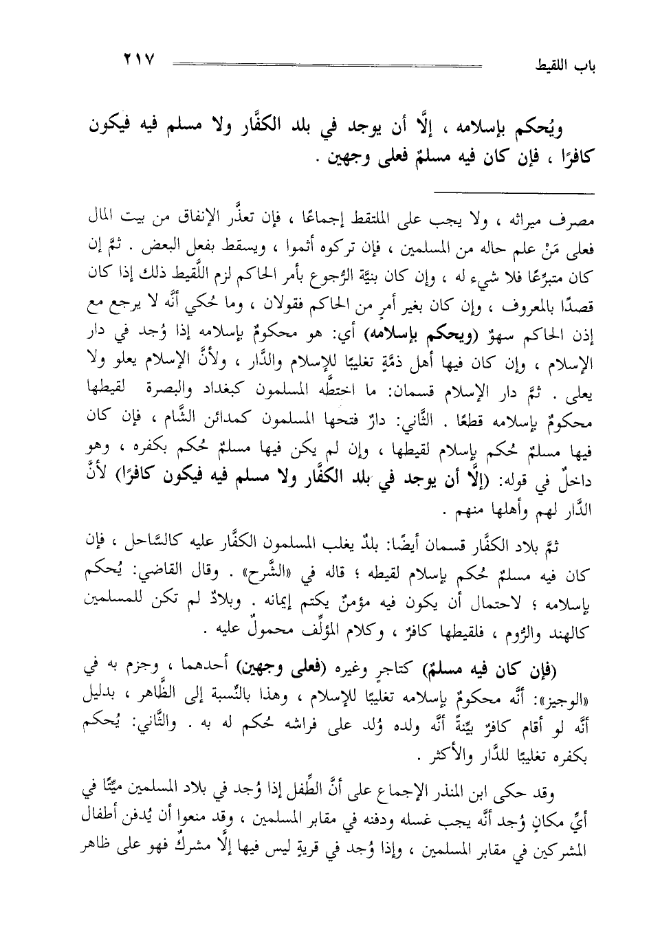 مصرف ميراثه ولا يجب على الملتقط إجماعا فإن تعذر الإنفاق من بيت المال فعلى من علم حاله من المسلمين فإن تركوه أثموا ويسقط بفعل البعض ثم إن كان متبرعا فلا شيء له وإن كان بنية الرجوع بأمر الحاكم لزم اللقيط ذلك إذا كانت قصدا بالمعروف وإن كان بغير أمر من الحاكم فقولان وما حكى أنه لا يرجع مع إذن الحاكم سهو "ويحكم بإسلامه" أي هو محكوم بإسلامه إذا وجد في دار الإسلام وإن كان فيها أهل ذمة تغلبيا للإسلام والدار ولأن الإسلام يعلو ولا يعلى ثم دار الإسلام قسمان ما اختطه المسلمون كبغداد والبصرة لقيطها محكوم بإسلامه قطعا الثاني دار فتحها المسلمون كمدائن الشام فإن كان فيها مسلم حكم بإسلام لقيطها وإن لم يكن فيها مسلم حكم بكفره وهو داخل في قوله "إلا أن يوجد في بلد الكفار ولا مسلم فيه فيكون كافرا" لأن الدار لهم وأهلها منهم