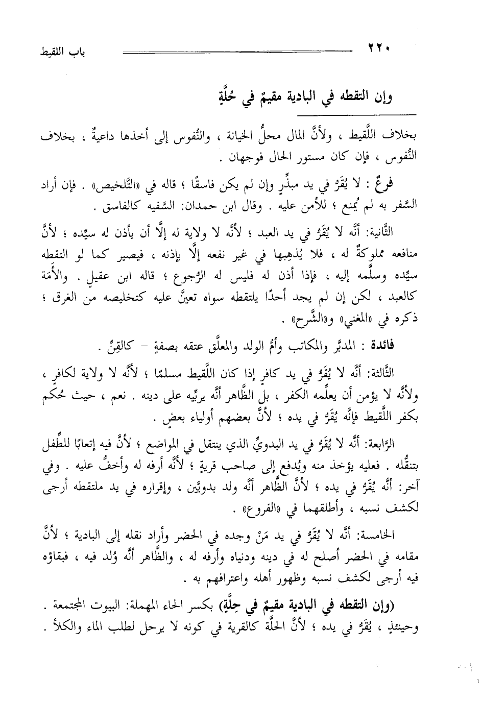 الرابعة أنه لا يقر في يد البدوي الذي ينتقل في المواضع لأن فيه إتعابا للطفل بتنقله فعليه يؤخذ منه ويدفع إلى صاحب قرية لأنه أرفه له وأخف عليه وفي آخر أنه يقر في يد لأن الظاهر أنه ولد بدويين وإقرار في يد ملتقطه أرجى لكشف نسبه وأطلقهما في الفروع
