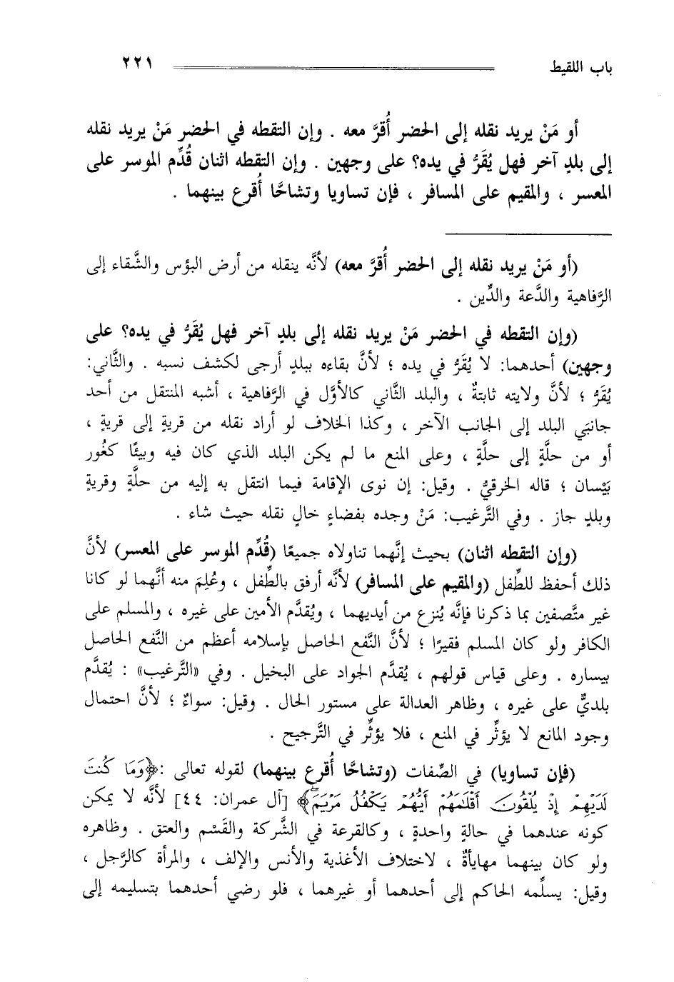أو من يريد نقله إلى الحضر أقر معه وإن التقطه في الحضر من يريد نقله إلى بلد آخر فهل يقر في يده على وجهين وإن التقطه اثنان قدم الموسر على المعسر والمقيم على المسافر فإن تساويا وتشاحا أقرع بينهما