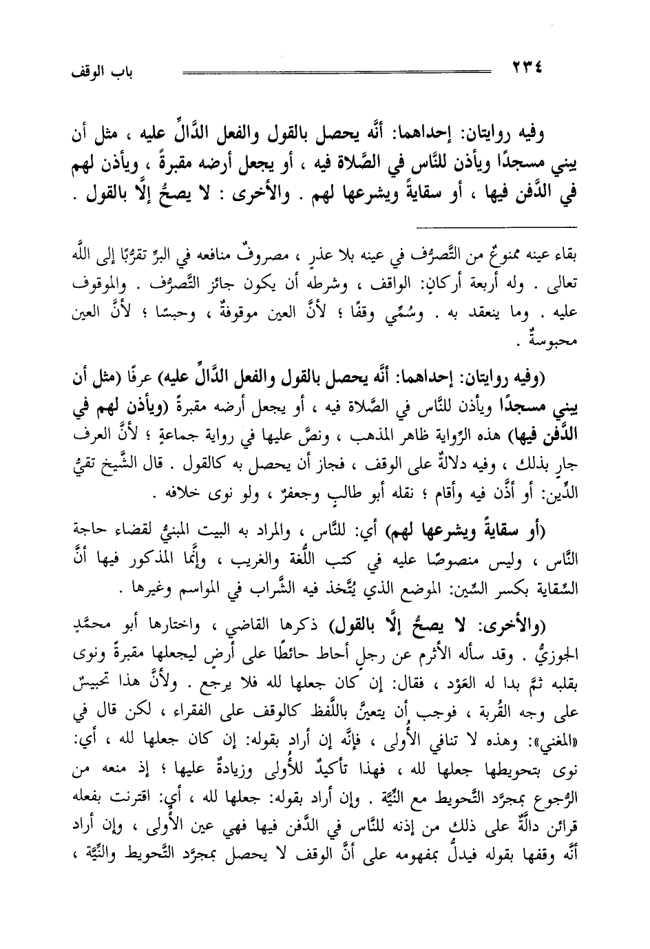 "والأخرى لا يصح إلا بالقول" ذكرها القاضي اختارها أبو محمد الجوزي وقد سأله الأثرم عن رجل أحاط حائطا على أرض ليجعلها مقبرة ونوى بقلبه ثم بدا له العود فقال إن كان جعلها لله فلا يرجع ولأن هذا تحبيس على وجه القربة فوجب أن يتعين باللفظ كالوقف على الفقراء لكن قال في المغني وهذه لا تنافي الأولى فإنه إن أراد بقوله إن كان جعلها لله أي نوى بتحويطها جعلها لله فهذا تأكيد للأولى وزيادة عليها إذ منعه من الرجوع بمجرد التحويط مع النية وإن أراد بقوله جعلها لله أي اقترنت بفعله قرائن دالة على ذلك من إذنه للناس في الدفن فيها فهي عين الأولى وإن أراد أنه وقفها بقوله فيدل بمفهومه على أن الوقف لا يحصل بمجرد التحويط والنية
