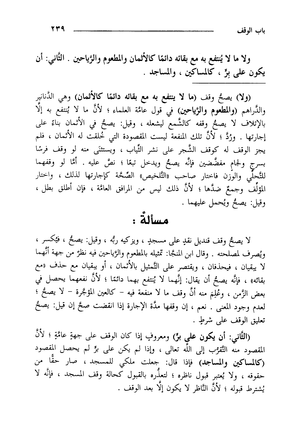 ولا ما لا ينتفع به مع بقائه دائما كالأثمان والمطعوم والرياحين الثاني أن يكون على بر كالمساكين والمساجد