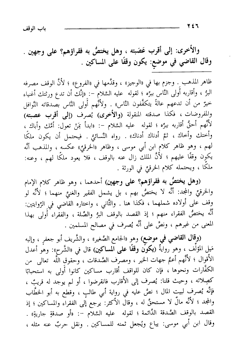 ظاهر المذهب وجزم بها في الوجيز وقدمها في الفروع لأن الوقف مصرفه البر وأقاربه أولى الناس ببره لقوله عليه السلام "إنك أن تدع ورثتك أغنياء خير من أن تدعهم عالة يتكففون الناس" ولأنهم أولى الناس بصدقاته النوافل والمفروضات فكذا صدقته المنقول "والأخرى" يصرف "إلى أقرب عصبته لأنهم أحق أقاربه ببره لقوله عليه السلام "ابدأ بمن تعول أمك وأباك وأختك وأخاك ثم أدناك أدناك" رواه النسائي فيحتمل أن يكون ملكا لهم وهو ظاهر كلام ابن أبي موسى وظاهر الخرقي عكسه والمذهب أنه يكون وقفا عليهم لأن الملك زال عنه بالوقف فلا يعود ملكا لهم وعنه ملكا ويحتلمه كلام الخرقي في الورثة "وهل يختص به فقراؤهم على وجهين" أحدهما وهو ظاهر كلام الإمام والخرقي والمجد أنه لا يختص بهم بل يشمل الفقير والغني منهما لأنه لو وقف على أولاده شملهما فكذا هنا والثاني واختاره القاضي في الروايتين أنه يختص الفقراء منهم إذ القصد بالوقف البر والصلة والفقراء أولى بهذا المعني من غيرهم ونص على أنه يصرف في مصالح المسلمين.
