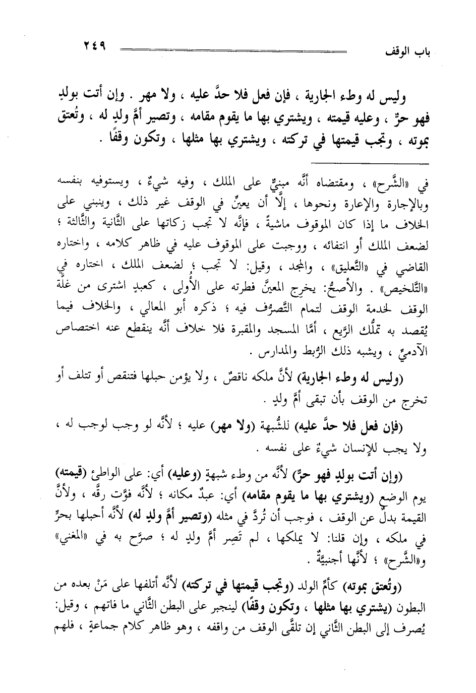 في الشرح ومقتاضاه أنه مبني على الملك وفيه شيء ويستوفيه بنفسه وبالإجارة والإعارة ونحوها إلا أن يعين في الوقف غير ذلك وينبني على الخلاف ما إذا كان الموقوف ماشية فإنه لا تجب زكاتها على الثانية والثالثة لضعف الملك أو انتفائه ووجبت على الموقوف عليه في ظاهر كلامه واختاره القاضي في التعليق والمجد وقيل لا تجب لضعف الملك اختاره في التلخيص والأصح يخرج المعين فطرته على الأولى كعبد اشتري من غلة الوقف لخدمة الوقف لتمام التصرف فيه ذكره أبو المعالي والخلاف فيما يقصد به تملك الريع أما المسجد والمقبرة فلا خلاف أنه ينقطع عنه اختصاص الآدمي ويشبه ذلك الربط والمدارس.
