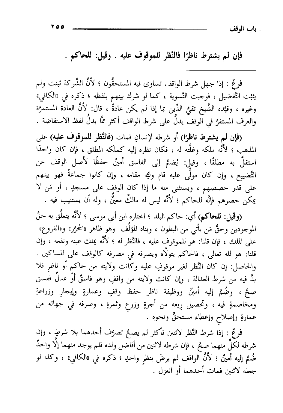 فإن لم يشترط ناظرا فالنظر للموقوف عليه وقيل للحاكم