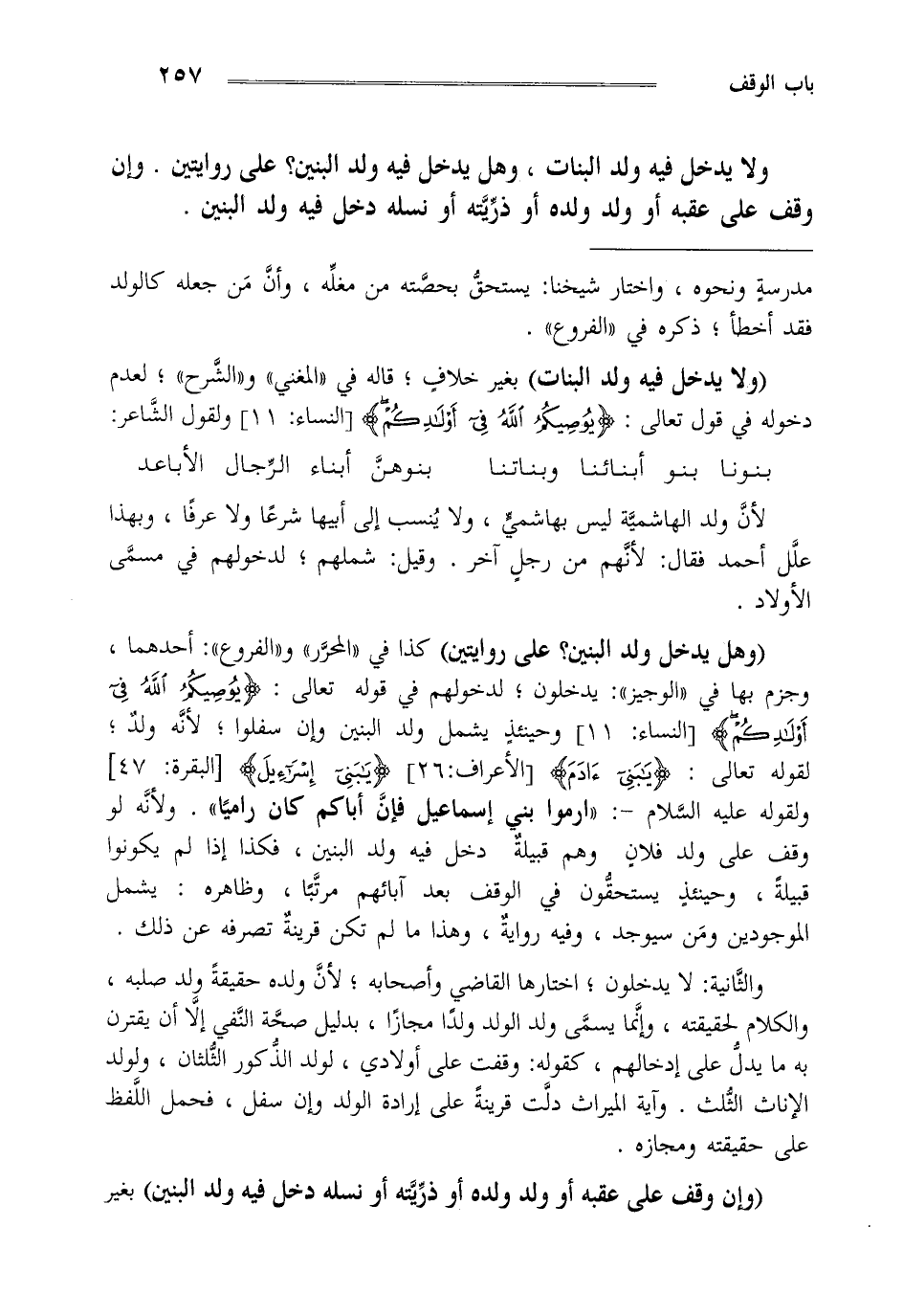 "وهل يدخل ولد البنين على روايتين" كذا في المحرر والفروع أحدهما وجزم بها في الوجيز يدخلون لدخولهم في قولهم تعالى {يُوصِيكُمُ اللَّهُ فِي أَوْلادِكُمْ} (النساء: من الآية11) وحينئذ يشمل ولد البنين وإن سفلوا لأنه ولد لقوله تعالى {يَا بَنِي آدَمَ} (الأعراف: من الآية26) {يَا بَنِي إِسْرائيلَ} (البقرة: من الآية47) ولقوله عليه السلام "ارموا بني اسماعيل فإن أباكم كان راميا" ولأنه لو وقف على ولد فلان وهم قبيلة دخل فيه ولد البنين فكذا إذا لم يكونوا قبيلة وحينئذ يستحقون في الوقف بعد آبائهم مرتبا وظاهره يشمل الموجودين ومن سيوجد وفيه رواية وهذا ما لم تكن قرينة تصرفه عن ذلك.