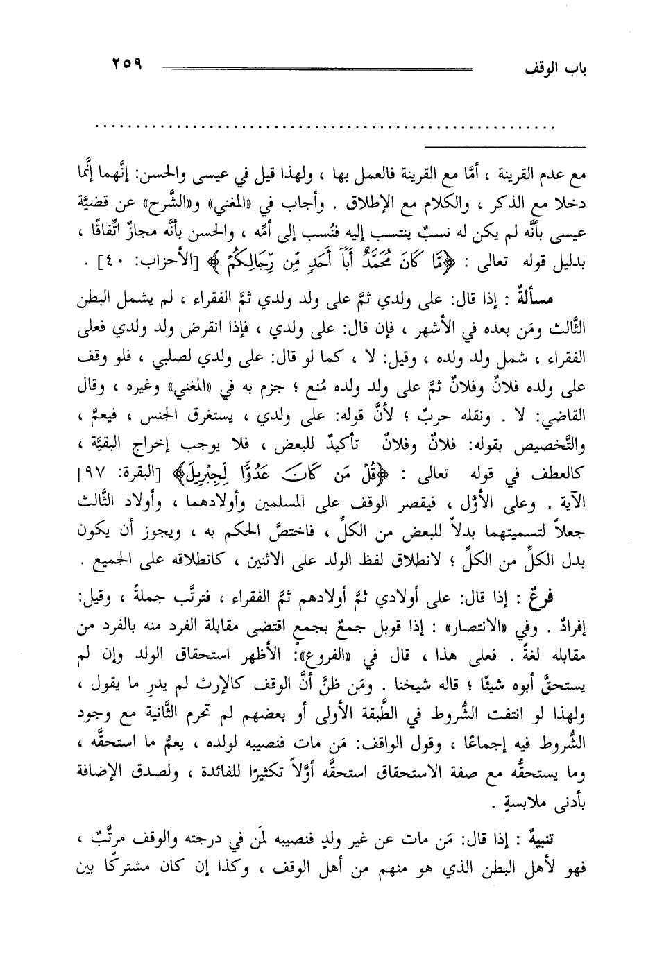 مسألة: إذا قال على ولدي ثم على ولده ولدي عند الفقراء لم يشمل البطن الثالث ومن بعده في الأشهر فإن قال على ولدي فإذا انقرض ولد ولدي فعلى الفقراء شمل ولد ولده وقيل لا كما لو قال على ولدي لصلبي فلو وقف على ولده فلان وفلان ثم على ولد ولده منع جزم به في المغني وغيره وقال القاضي لا ونقله حرب لأن قوله على ولدي يستغرق الجنس فيعم والتخصيص بقوله فلان وفلان تأكيد للبعض فلا يوجب إخراج البقية كالعطف في قوله تعالى {قُلْ مَنْ كَانَ عَدُوّاً لِجِبْرِيلَ} (البقرة: من الآية97) وعلى الأول فيقصر الوقف على المسلمين وأولادهما وأولاد الثالث جعلا لتسميتهما بدلا للبعض من الكل فاختص الحكم به ويجوز أن يكون بدل الكل من الكل لانطلاق لفظ الولد على الأثنين كانطلاقه على الجميع