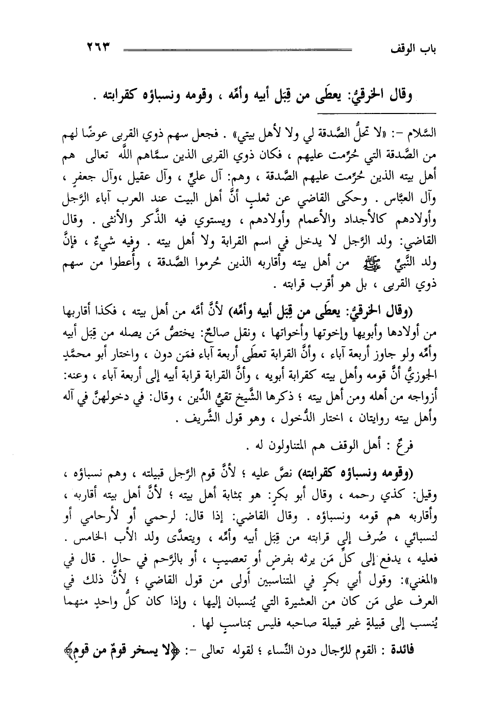 "وقال الخرقي يعطي من قبل أبيه وأمه" لأن أمه من أهل بيته فكذا أقاربها من أولادها وأبويها وإخوتها وأخواتها ونقل صالح يختص من يصله من قبل أبيه وأمه ولو جاوز أربعة آباء وإن القرابه تعطى أربعة آباء فمن دون واختار أبو محمد الجوزي أن قومه وأهل بيته كقرابة أبويه وأن القرابة قرابة أبيه إلى أربعة آباء وعنه أزواجه من أهله ومن أهل بيته ذكرها الشيخ تقي الدين وقال في دخولهن في آله وأهل بيته روايتان اختار الدخول وهو قول الشريف