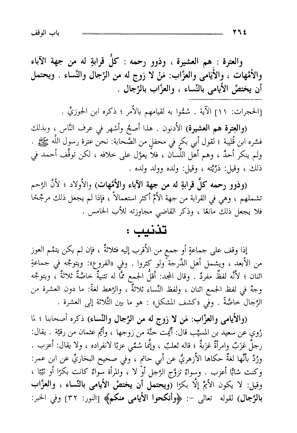 "والعترة هم العشيرة" الأدنون هذا أصح وأشهر في عرف الناس وبذلك فسره ابن قتيبة لقول أبي بكر في محفل من الصحابة نحن عترة رسول الله صلى الله عليه وسلم ولم ينكر أحد وهم أهل اللسان فلا يعول على خلافه لكن توقف أحمد في ذلك وقيل ذريته وقيل ولده وولد ولده.