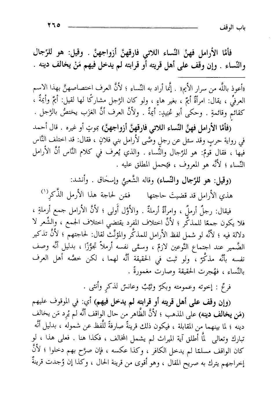 فأما الأرامل فهن النساء اللاتي فارقهن أزواجهن وقيل هو للرجال وللنساء وإن وقف على أهل قريته أو قرابته لم يدخل فيهم من يخالف دينه.