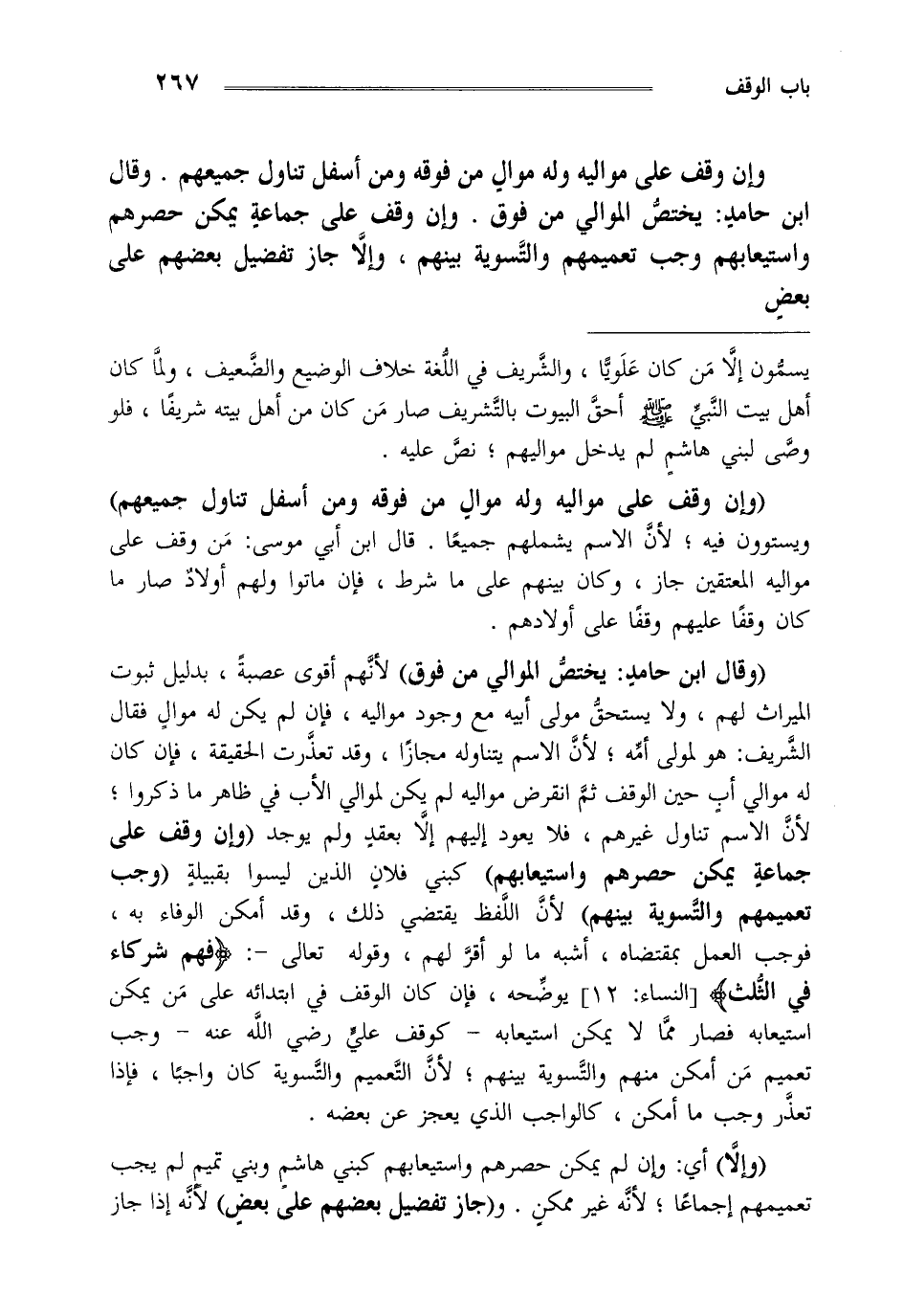 "وقال ابن حامد يختص الموالي من فوق لأنهم أقوى عصبة بدليل ثبوت الميراث لهم ولا يستحق مولى أبيه مع وجود مواليه فإن لم يكن له موال فقال الشريف هو لمولى أمه لأن الاسم يتناوله مجازا وقد تعذرت الحقيقة فإن كان له موالي أب حين الوقف ثم انقرض مواليه لم يكن لموالي الأب في ظاهر ما ذكروا لأن الأسم تناول غيرهم فلا يعود إليهم إلا بعقد ولم يوجد "وإن وقف على جماعة يمكن حصرهم واستيعابهم" كبني فلان الذين ليسوا بقبيلة "وجب تعميمهم والتسوية بينهم" لأن اللفظ يقتضى ذلك وقد أمكن الوفاء به فوجب العمل بمقتضاه اشبه ما لو أقر لهم وقوله تعالى {فَهُمْ شُرَكَاءُ فِي الثُّلُثِ} (النساء: من الآية12) يوضحه فإن كان الوقف في ابتدائه على من يمكن استيعابه فصار مما لا يمكن استيعابه كوقف علي رضي الله عنه وجب تعميم من أمكن منهم والتسوية بينهم لأن التعميم والتسوية كان واجبا فإذا تعذر وجب ما أمكن كالواجب الذي يعجز عن بعضه "وإلا" أي وإن لم يمكن حصرهم واستيعابهم كبني هاشم وبني تميم لم يجب تعميمهم إجماعا لأنه غير ممكن "وجاز تفضيل بعضهم على بعض" لأنه إذا جاز