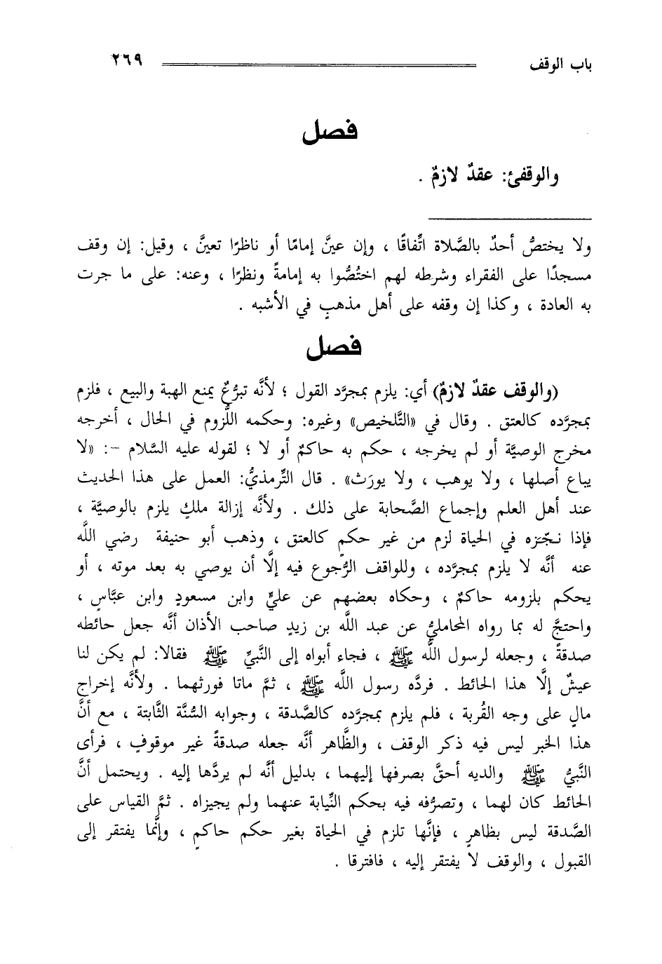 "والوقف عقد لازم" أي يلزم بمجرد القول لأنه تبرع يمنع البيع والهبة فلزم بمجرد كالعتق وقال في التلخيص وغيره وحكمه اللزوم في الحال أخرجه مخرج الوصية أو لم يخرجه حكم به حاكم أولا لقوله عليه السلام لا يباع أصلها ولا يوهب ولا يورث قال الترمذي العمل على هذا الحديث عند أهل العلم وإجماع الصحابة على ذلك ولأنه إزالة ملك يلزم بالوصية فإذا نجزه في الحياة لزم من غير حكم كالعتق وذهب أبو حنيفة رضي الله عنه أنه لايلزم بمجرده وللواقف الرجوع فيه إلا أن يوصى به بعد موته أو يحكم بلزومه حاكم وحكاه بعضهم عن علي وابن مسعود وابن عباس واحتج له بما رواه المحاملي عن عبدالله بن زيد صاحب الأذان أنه جعل حائطه صدقة وجعله لرسول الله صلى الله عليه وسلم فجاء أبواه إلى النبي صلى الله عليه وسلم فقالا لم يكن لنا عيش إلا هذا الحائط فرده رسول الله صلى الله عليه وسلم ثم ماتا فورثهما ولأنه إخراج مال على وجه القربة فلم يلزم بمجرده كالصدقة وجوابه السنة الثابتة مع أن هذا الخبر ليس فيه ذكر الوقف والظاهر أنه جعله صدقة غير موقوف فرأى النبي صلى الله عليه وسلم والديه أحق بصرفها إليهما بدليل أنه لم يردها إليه ويحتمل أن الحائظ كان لهما وتصرفه فيه بحكم النيابة عنهما ولم يجيزاه عند القياس على الصدقة ليس بظاهر فإنها تلزم في الحياة بغير حكم حاكم وإنما يفتقر إلى القبول والوقف لا يفتقر إليه فافترقا
