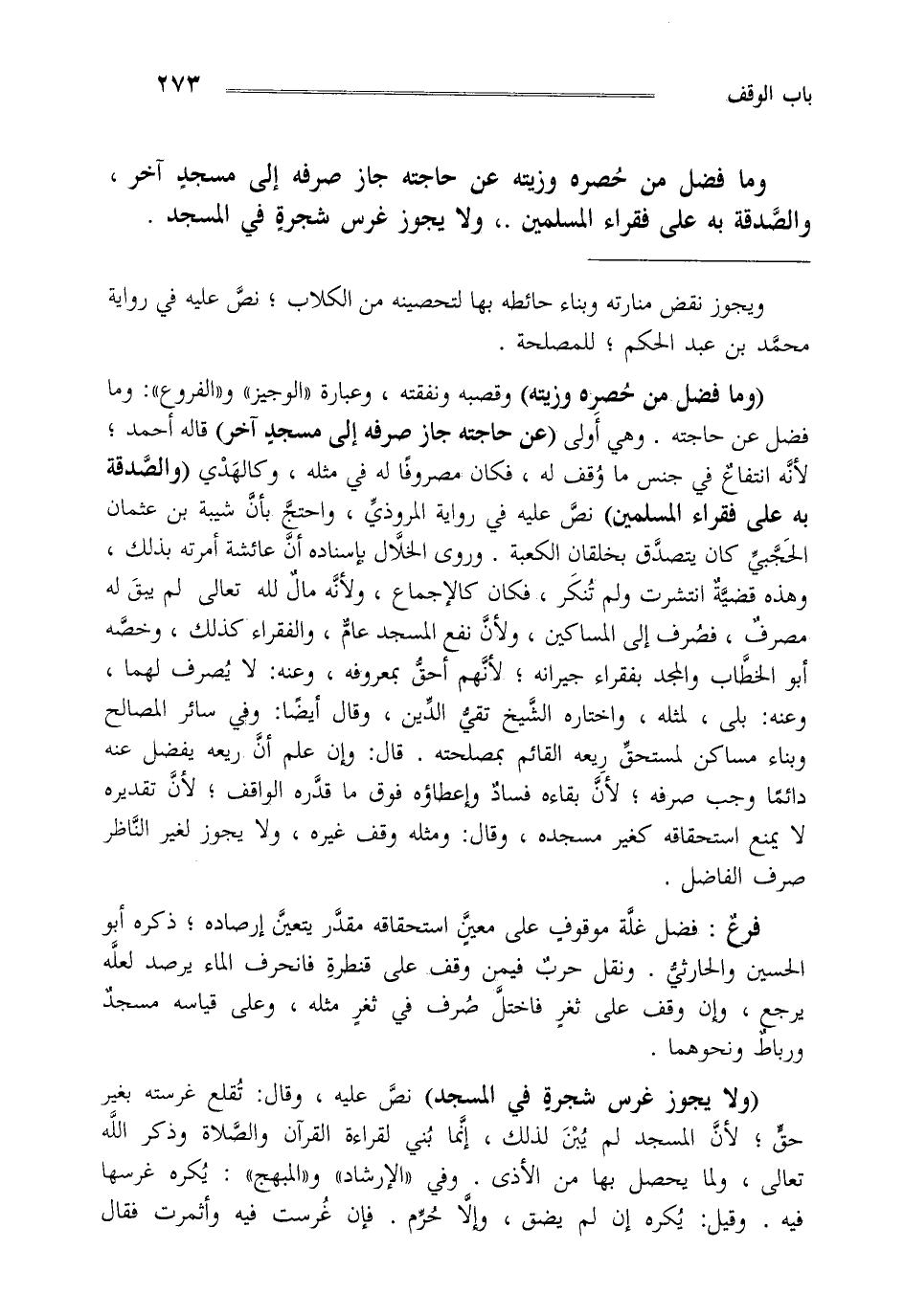 "وما فضل من حصره وزيته" وقصبه ونفقته وعبارة الوجيز والفروع وما فضل عن حاجته وهي أولى "عن حاجته جاز صرفه إلى مسجد آخر" قاله أحمد لأنه انتفاع في جنس ما وقف له فكان مصروفا له في مثله وكالهدي "والصدقة به على فقراء المسلمين" نص عليه في رواية المروذي واحتج بأن شيبة بن عثمان الحجي كان يتصدق بخلقان الكعبة وروى الخلال بإسناده أن عائشة أمرته بذلك وهذه قضية انتشرت ولم تنكر فكان كالإجماع ولأنه مال لله تعالى لم يبق له مصرف فصرف إلى المساكين ولأن نفع المسجد عام والفقراء كذلك وخصه أبو الخطاب والمجد بفقراء جيرانه لأنهم أحق بمعروفه وعنه لا يصرف لهما وعنه بلى لمثله واختاره الشيخ تقي الدين وقال أيضا وفي سائر المصالح وبناء مساكن لمستحق ريعه القائم بمصلحته قال وإن علم أن ريعه يفضل عنه دائما وجب صرفه لأن بقاءه فساد وإعطاؤه فوق ما قدره الواقف لأن تقديره لا يمنع استحقاقه كغير مسجده وقال ومثله وقف غيره ولا يجوز لغير الناظر صرف الفاضل