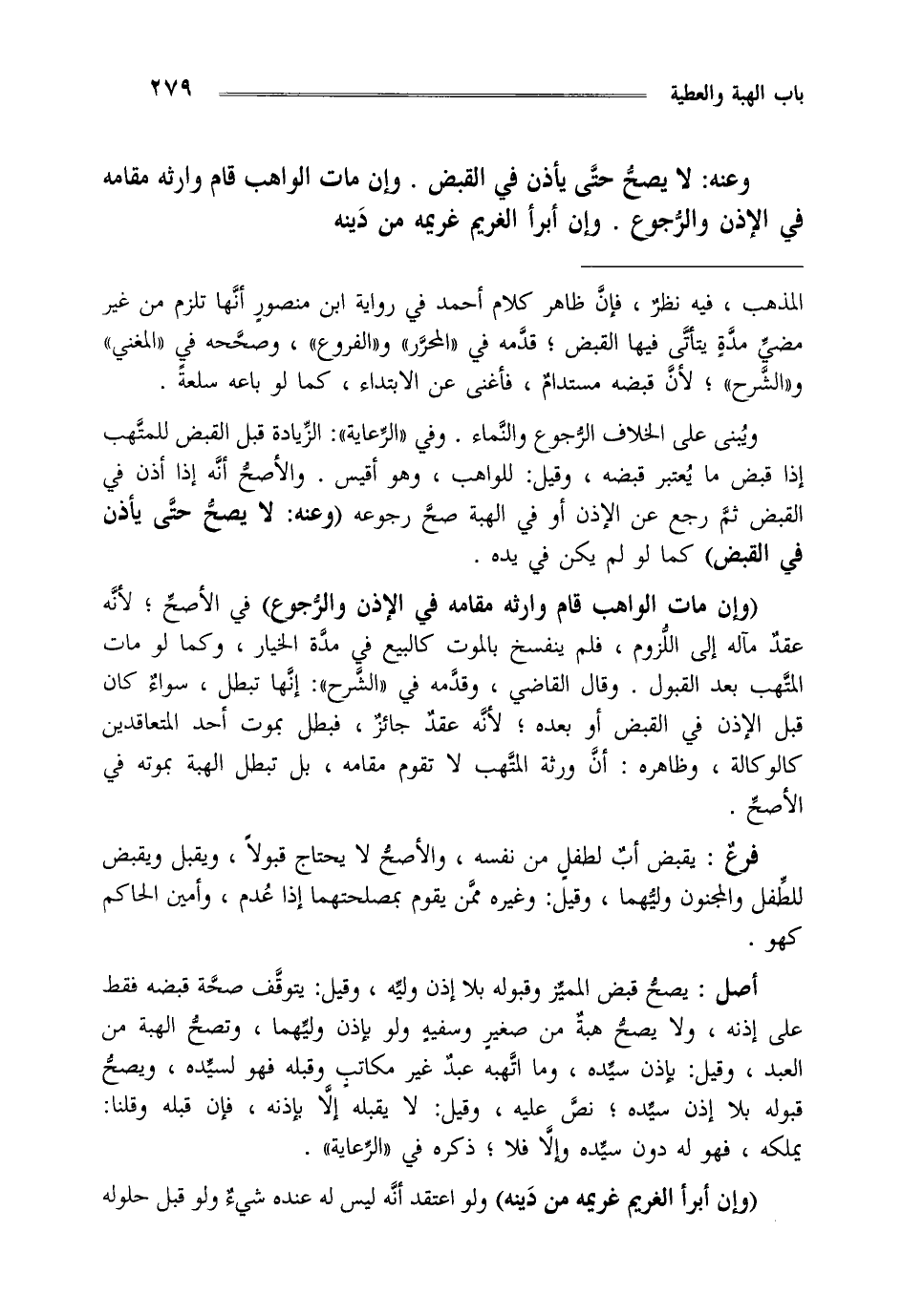 ويبنى على الخلاف الرجوع والنماء وفي الرعاية الزيادة قبل القبض للمتهب إذا قبض ما يعتبر قبضه وقيل للواهب وهو أقيس والأصح أنه إذا أذن في القبض ثم رجع عن الإذن أو في الهبة صح رجوعه "وعنه لا يصح حتى يأذن في القبض" كما لو لم يكن في يده.