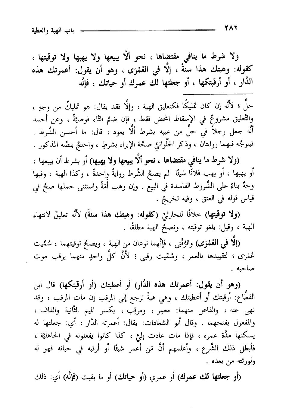 ولا شرط ما ينافي مقتضاها نحو ألا يبيعها ولا يهبها ولا توقيتها كقوله وهبتك هذا سنة إلا في العمرى وهو أن يقول أعمرتك هذه الدار أو أرقبتكها أو جعلتها لك عمرك أو حياتك فإنه