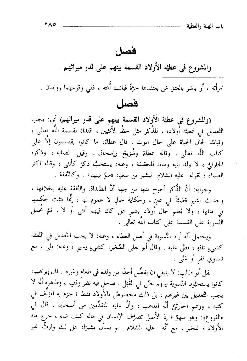 "والمشروع في عطية الأولاد القسمة بينهم على قدر ميراثهم" أي يجب التعديل في عطية أولاده للذكر مثل حظ الانثيين اقتداء بقسمة الله تعالى وقياسا لحال الحياة على حال الموت قال عطاء ما كانوا يقتسمون إلا على كتاب الله تعالى وقاله عطاء وشريح وإسحاق وقيل لصلبه وذكره الحارثي لا ولد بنيه وبناته للحقيقة وعنه يستحب ذكر كأنثى وقاله أكثر العلماء لقوله عليه السلام لبشير بن سعد "سو بينهم" وكالنفقة