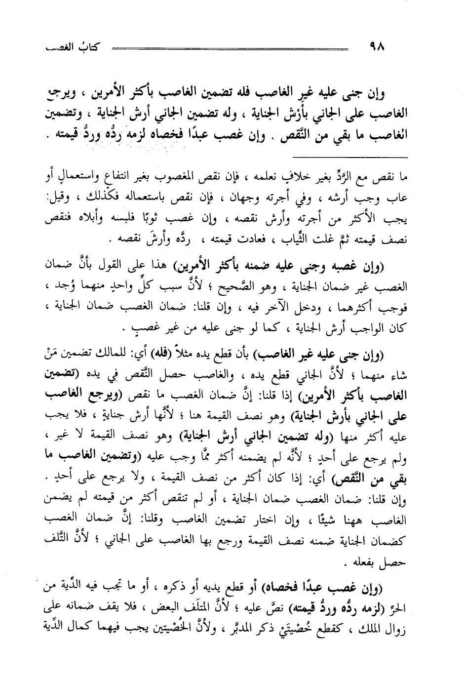 "وإن جنى عليه غير الغاصب" بأن قطع يده مثلا "فله" أي للمالك تضمين من شاء منهما لأن الجاني قطع يده والغاصب حصل النقص في يده "تضمين الغاصب بأكثر الأمرين" إذا قلنا إن ضمان الغصب ما نقص "ويرجع الغاصب على الجاني بأرش الجناية" وهو نصف القيمة هنا لأنها أرش جناية فلا يجب عليه أكثر منها وله تضمين الجاني أرش الجناية وهو نصف القيمة لاغير ولم يرجع على أحد لأنه لم يضمنه أكثر مما وجب عليه "وتضمين الغاصب ما بقي من النقص" أي إذا كان أكثر من نصف القيمة ولا يرجع على أحد وإن قلنا ضمان الغصب ضمان الجناية أو لم تنقص أكثر من قيمته لم يضمن الغاصب ها هنا شيئا وإن اختار تضمين الغاصب وقلنا إن ضمان الغصب كضمان الجناية ضمنه نصف القيمة ورجع بها الغاصب على الجاني لأن التلف حصل بفعله.