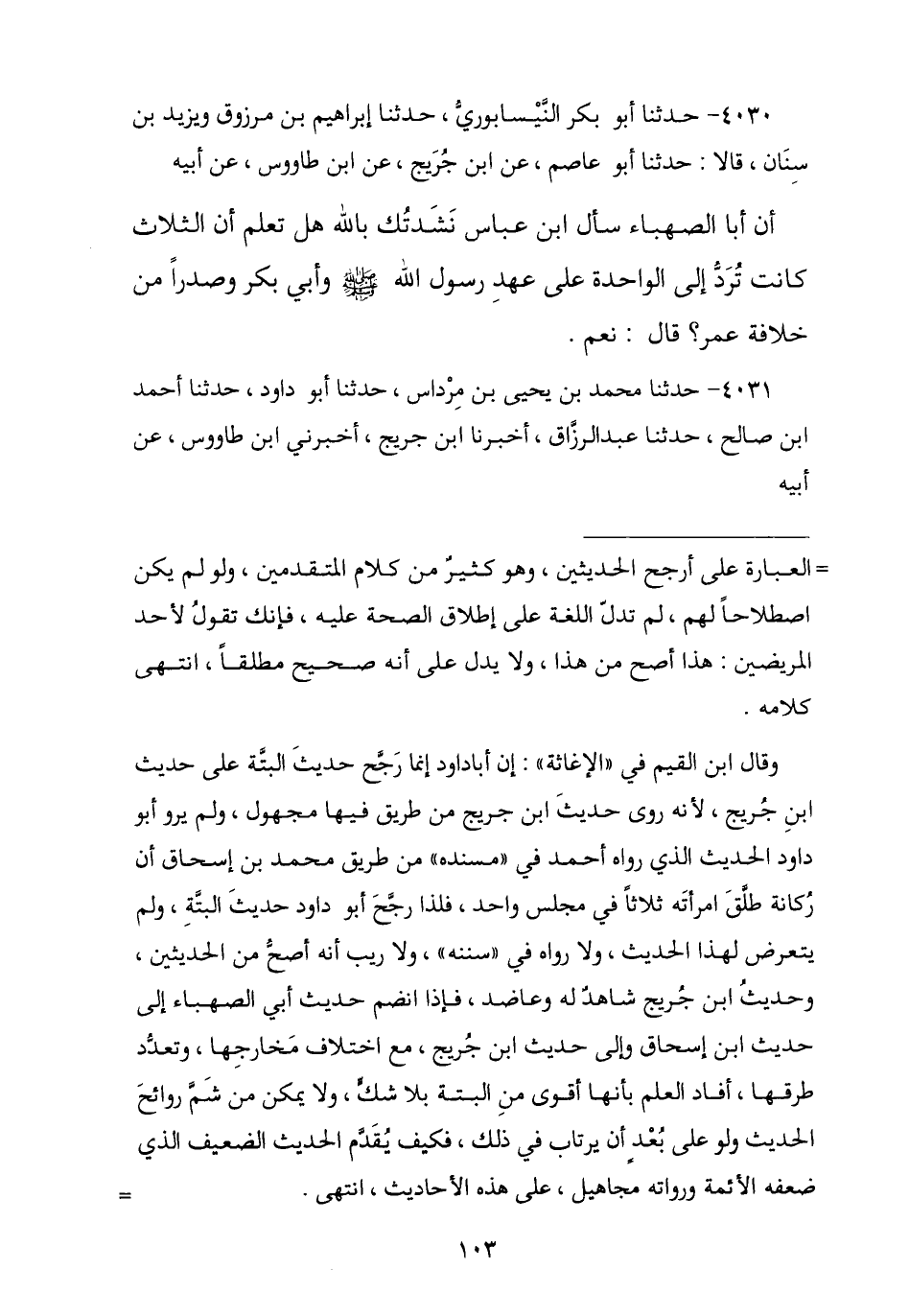 4031 - نا مُحَمَّدُ بْنُ يَحْيَى بْنِ مِرْدَاسٍ , نا أَبُو دَاوُدَ , نا أَحْمَدُ بْنُ صَالِحٍ , نا عَبْدُ الرَّزَّاقِ , أنا ابْنُ جُرَيْجٍ , أَخْبَرَنِي ابْنُ طَاوُسٍ , عَنْ أَبِيهِ , -[104]- أَنَّ أَبَا الصَّهْبَاءِ قَالَ لِابْنِ عَبَّاسٍ: أَتَعْلَمُ إِنَّمَا كَانَتِ §الثَّلَاثُ تُجْعَلُ وَاحِدَةً عَلَى عَهْدِ رَسُولِ اللَّهِ صَلَّى اللهُ عَلَيْهِ وَسَلَّمَ , وَأَبِي بَكْرٍ , وَثَلَاثٍ مِنْ إِمَارَةِ عُمَرَ؟ , فَقَالَ ابْنُ عَبَّاسٍ: «نَعَمْ»