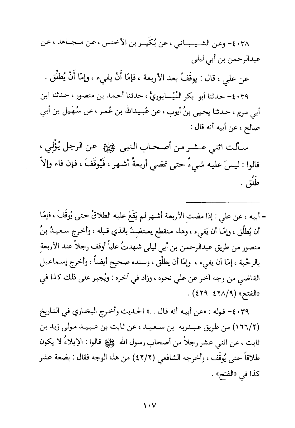 4038 - وَعَنِ الشَّيْبَانِيِّ , عَنْ بُكَيْرِ بْنِ الْأَخْنَسِ , عَنْ مُجَاهِدٍ , عَنْ عَبْدِ الرَّحْمَنِ بْنِ أَبِي لَيْلَى , عَنْ عَلِيٍّ , قَالَ: § «يُوقَفُ بَعْدَ الْأَرْبَعَةِ فَإِمَّا أَنْ يَفِيءَ وَإِمَّا أَنْ يُطَلِّقَ»