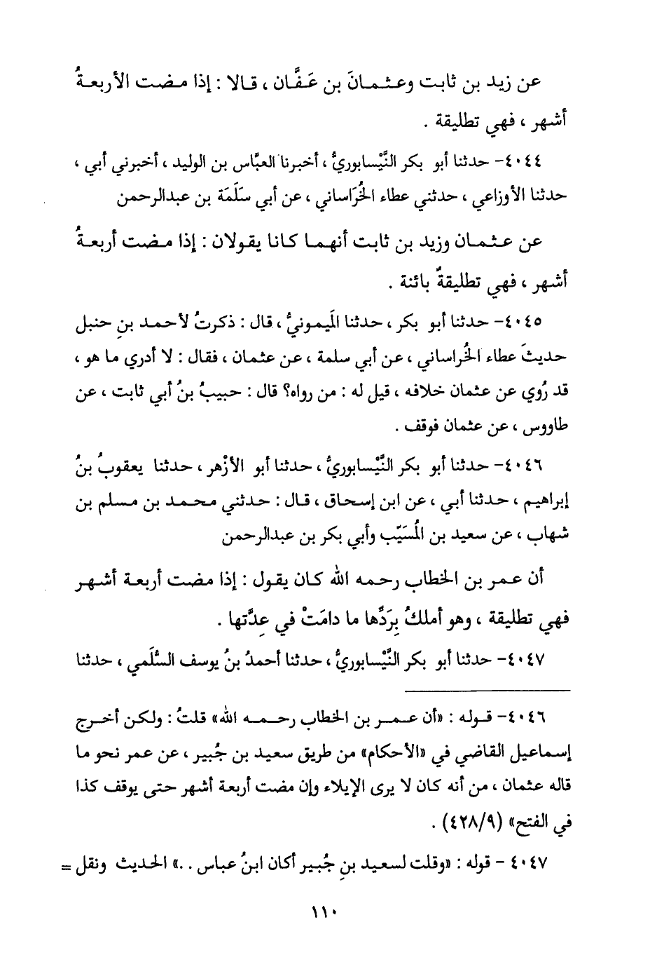 4044 - نا أَبُو بَكْرٍ النَّيْسَابُورِيُّ , نا الْعَبَّاسُ بْنُ الْوَلِيدِ , أَخْبَرَنِي أَبِي , نا الْأَوْزَاعِيُّ , حَدَّثَنِي عَطَاءٌ الْخُرَاسَانِيُّ , عَنْ أَبِي سَلَمَةَ بْنِ عَبْدِ الرَّحْمَنِ , عَنْ عُثْمَانَ , وَزَيْدِ بْنِ ثَابِتٍ أَنَّهُمَا كَانَا يَقُولَانِ: § «إِذَا مَضَتِ الْأَرْبَعَةُ أَشْهُرٍ فَهِيَ تَطْلِيقَةٌ بَائِنَةٌ»