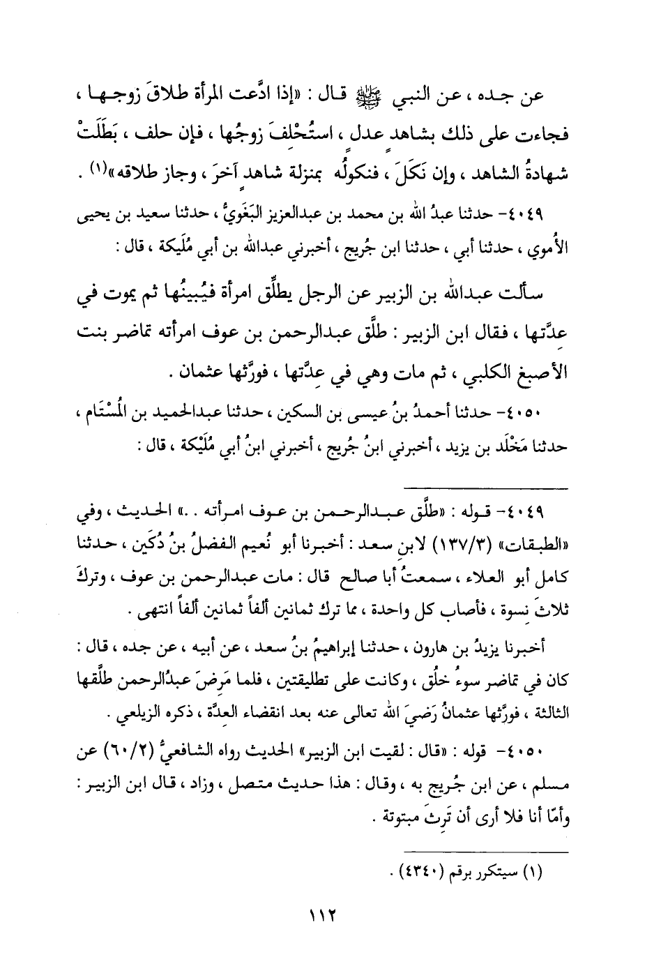 4049 - نا عَبْدُ اللَّهِ بْنُ مُحَمَّدِ بْنِ عَبْدِ الْعَزِيزِ الْبَغَوِيُّ , نا سَعِيدُ بْنُ يَحْيَى الْأُمَوِيُّ , نا أَبِي , نا ابْنُ جُرَيْجٍ , أَخْبَرَنِي عَبْدُ اللَّهِ بْنُ أَبِي مُلَيْكَةَ , قَالَ: سَأَلْتُ عَبْدَ اللَّهِ بْنَ الزُّبَيْرِ عَنِ الرَّجُلِ يُطَلِّقُ امْرَأَتَهُ فَيَبُتُّهَا ثُمَّ يَمُوتُ فِي عِدَّتِهَا؟ , فَقَالَ ابْنُ الزُّبَيْرِ: «طَلَّقَ عَبْدُ الرَّحْمَنِ بْنُ عَوْفٍ امْرَأَتَهُ تُمَاضِرَ بِنْتَ الْأَصْبَغِ الْكَلْبِيَّةَ ثُمَّ §مَاتَ وَهِيَ فِي عِدَّتِهَا فَوَرَّثَهَا عُثْمَانُ»