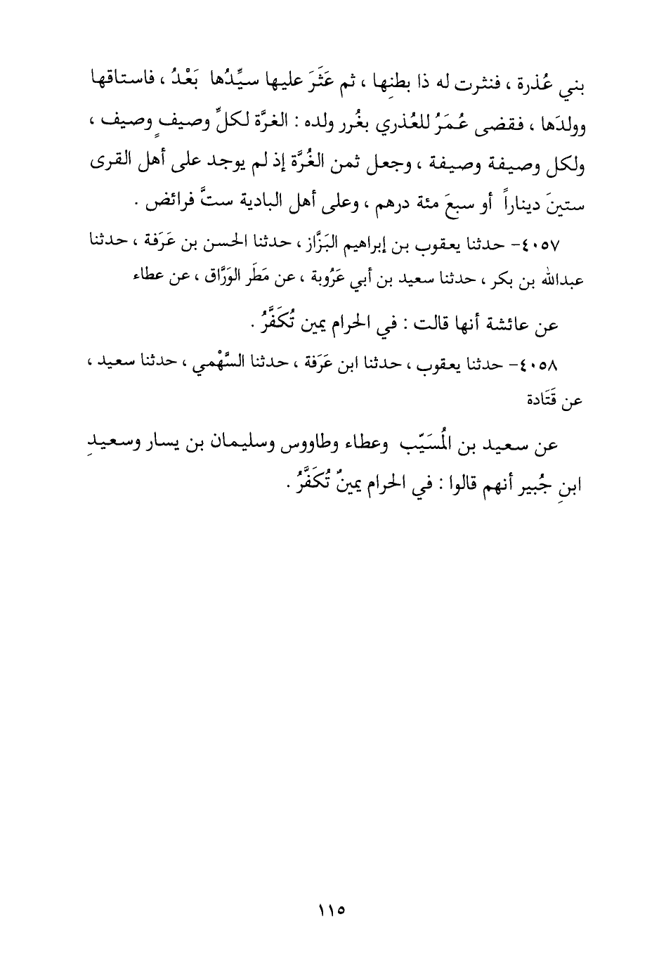 4058 - نا يَعْقُوبُ , نا ابْنُ عَرَفَةَ , نا السَّهْمِيُّ , عَنْ سَعِيدٍ , عَنْ قَتَادَةَ , عَنْ سَعِيدِ بْنِ الْمُسَيِّبِ , وَعَطَاءٍ , وَطَاوُسٍ , وَسُلَيْمَانَ بْنِ يَسَارٍ , وَسَعِيدِ بْنِ جُبَيْرٍ , أَنَّهُمْ قَالُوا: § «فِي الْحَرَامِ يَمِينٌ تُكَفِّرُ»