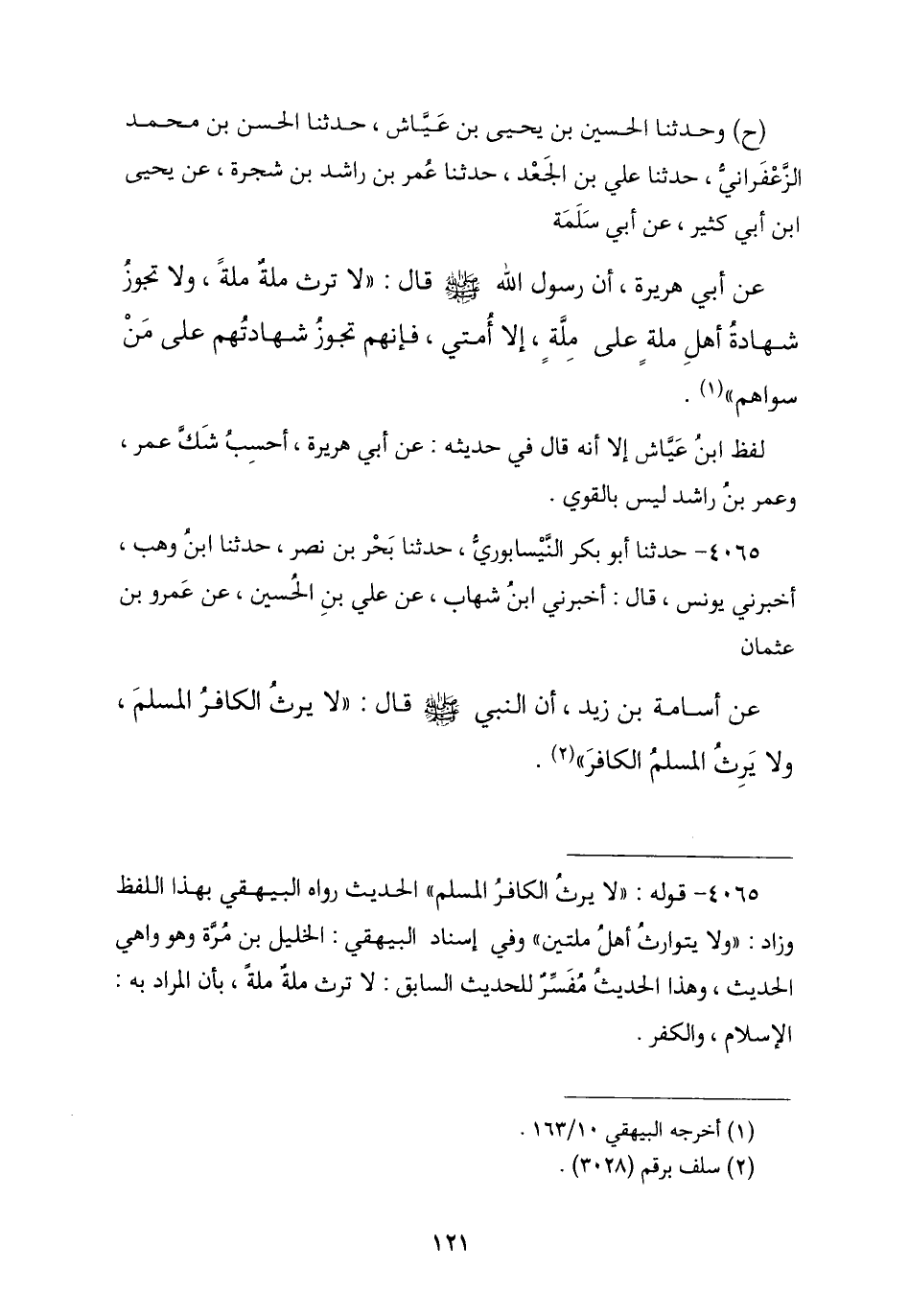 4065 - نا أَبُو بَكْرٍ النَّيْسَابُورِيُّ , نا بَحْرُ بْنُ نَصْرٍ , نا ابْنُ وَهْبٍ , أَخْبَرَنِي يُونُسُ , أَخْبَرَنِي ابْنُ شِهَابٍ , عَنْ عَلِيِّ بْنِ الْحُسَيْنِ , عَنْ عَمْرِو بْنِ عُثْمَانَ , عَنْ أُسَامَةَ بْنِ زَيْدٍ , عَنِ النَّبِيِّ صَلَّى اللهُ عَلَيْهِ وَسَلَّمَ قَالَ: § «لَا يَرِثُ الْكَافِرُ الْمُسْلِمَ وَلَا الْمُسْلِمُ الْكَافِرَ»