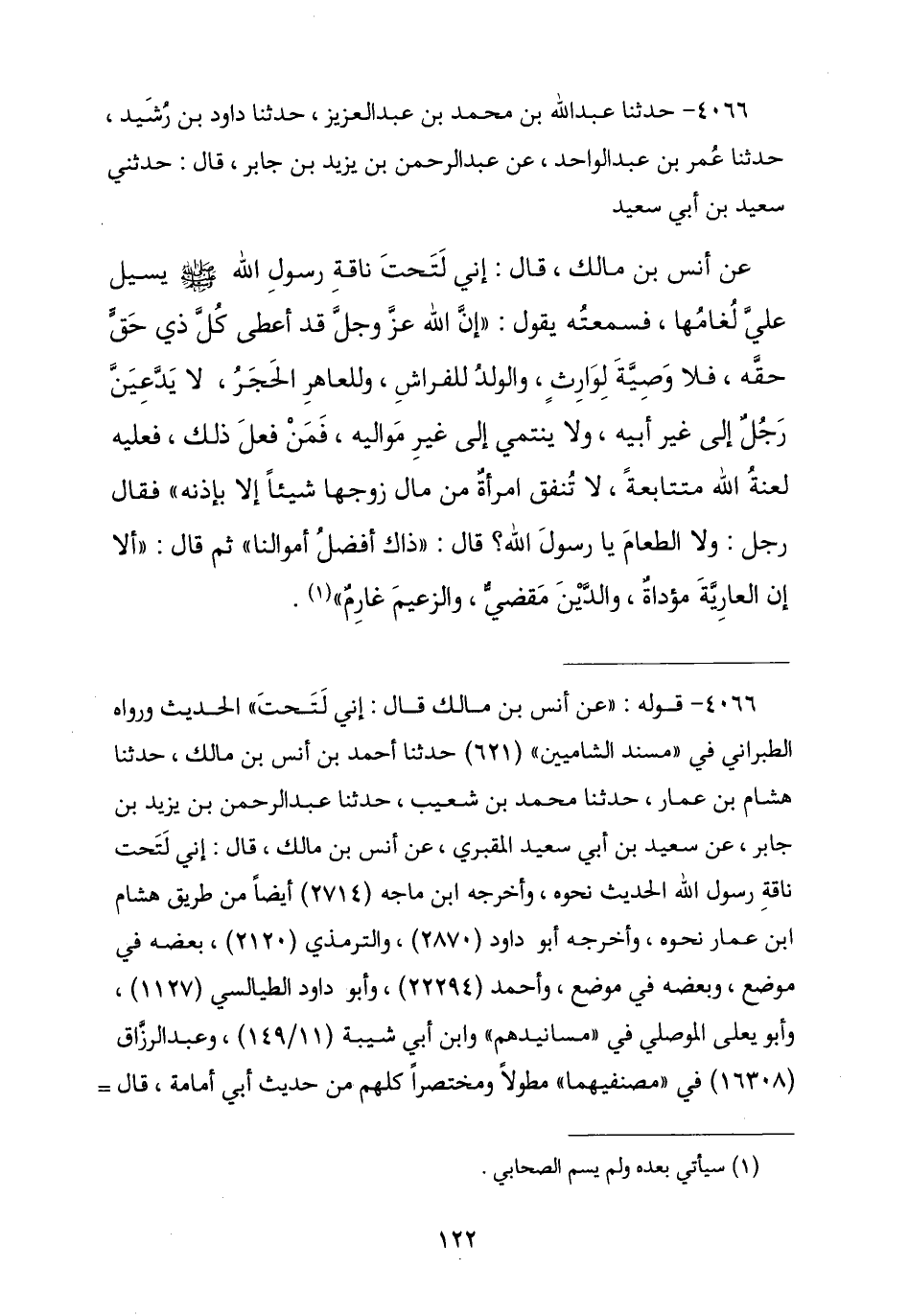 4066 - نا عَبْدُ اللَّهِ بْنُ مُحَمَّدِ بْنِ عَبْدِ الْعَزِيزِ , نا دَاوُدُ بْنُ رُشَيْدٍ , نا عَمْرُ بْنُ عَبْدِ الْوَاحِدِ , عَنْ عَبْدِ الرَّحْمَنِ بْنِ يَزِيدَ بْنِ جَابِرٍ , نا سَعِيدُ بْنُ أَبِي سَعِيدٍ , عَنْ أَنَسِ بْنِ مَالِكٍ , قَالَ: إِنِّي لَتَحْتَ نَاقَةِ رَسُولِ اللَّهِ صَلَّى اللهُ عَلَيْهِ وَسَلَّمَ يَسِيلُ عَلَيَّ لُعَابُهَا فَسَمِعْتُهُ يَقُولُ: § «إِنَّ اللَّهَ عَزَّ وَجَلَّ قَدْ أَعْطَى كُلَّ ذِي حَقٍّ حَقَّهُ فَلَا وَصِيَّةَ لِوَارِثٍ , وَالْوَلَدُ لِلْفِرَاشِ وَلِلْعَاهِرِ الْحَجَرُ , لَا يَدَّعِينَ رَجُلٌ إِلَى غَيْرِ أَبِيهِ وَلَا يَنْتَمِي إِلَى غَيْرِ مَوَالِيهِ فَمَنْ فَعَلَ ذَلِكَ فَعَلَيْهِ لَعْنَةُ اللَّهِ مُتَتَابِعَةً لَا تُنْفِقُ الْمَرْأَةُ شَيْئًا مِنْ بَيْتِ زَوْجِهَا إِلَّا بِإِذْنِهِ» , فَقَالَ رَجُلٌ: وَلَا الطَّعَامَ يَا رَسُولَ اللَّهِ؟ , قَالَ: «ذَاكَ أَفْضَلُ أَمْوَالِنَا» , ثُمَّ قَالَ: «أَلَا إِنَّ الْعَارِيَةَ مُؤَدَّاةٌ , وَالدَّيْنَ مَقْضِيٌّ , وَالزَّعِيمُ غَارِمٌ». -[123]-