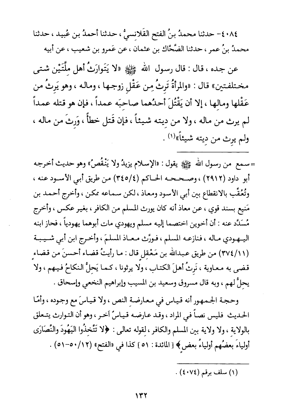 4084 - نا مُحَمَّدُ بْنُ الْفَتْحِ الْقَلَانِسِيُّ , نا أَحْمَدُ بْنُ عُبَيْدٍ , نا مُحَمَّدُ بْنُ عُمَرَ , نا الضَّحَّاكُ بْنُ عُثْمَانَ , عَنْ عَمْرِو بْنِ شُعَيْبٍ , عَنْ أَبِيهِ , عَنْ جَدِّهِ , قَالَ: قَالَ رَسُولُ اللَّهِ صَلَّى اللهُ عَلَيْهِ وَسَلَّمَ: «§لَا يَتَوَارَثُ أَهْلُ مِلَّتَيْنِ شَتَّى مُخْتَلِفَتَيْنِ» , قَالَ: «وَالْمَرْأَةُ تَرِثُ مِنْ عَقْلِ زَوْجِهَا وَمَالِهِ , وَهُوَ يَرِثُ مِنْ عَقْلِهَا وَمَالِهَا إِلَّا أَنْ يَقْتُلَ أَحَدُهُمَا صَاحِبَهُ , فَإِنْ هُوَ قَتَلَهُ عَمْدًا لَمْ تَرِثْ مِنْ مَالِهِ وَلَا مِنْ دِيَتِهِ شَيْئًا , فَإِنْ قَتَلَ خَطَأً وَرِثَ مِنْ مَالِهِ وَلَمْ تَرِثْ مِنْ دِيَتِهِ شَيْئًا»