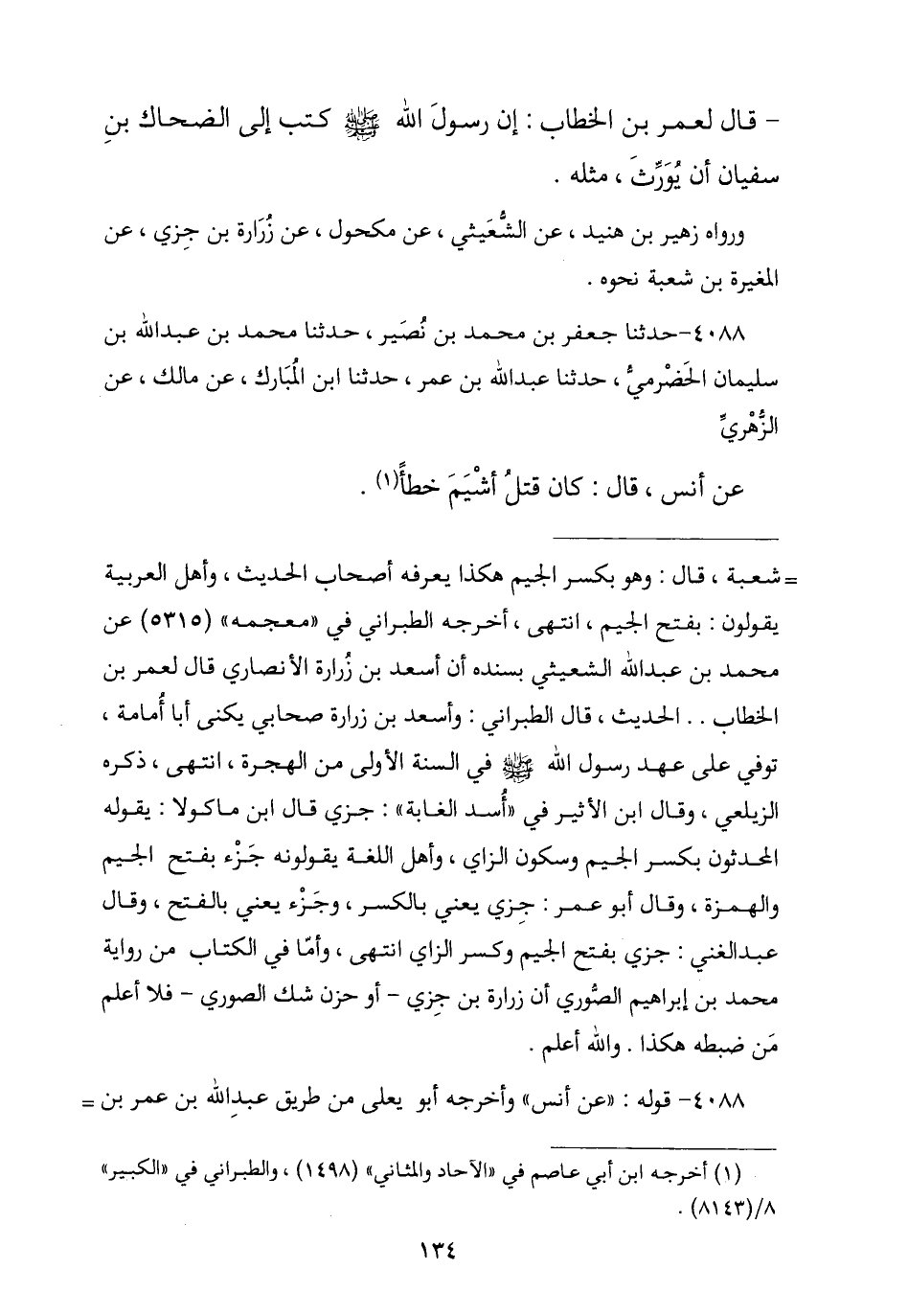 4088 - نا جَعْفَرُ بْنُ مُحَمَّدِ بْنِ نُصَيْرٍ , نا مُحَمَّدُ بْنُ عَبْدِ اللَّهِ بْنِ سُلَيْمَانَ الْحَضْرَمِيُّ , نا عَبْدُ اللَّهِ بْنُ عُمَرَ , نا ابْنُ الْمُبَارَكِ , عَنِ الزُّهْرِيِّ , عَنْ أَنَسٍ , قَالَ: § «كَانَ قَتْلُ أَشْيَمَ خَطَأً»