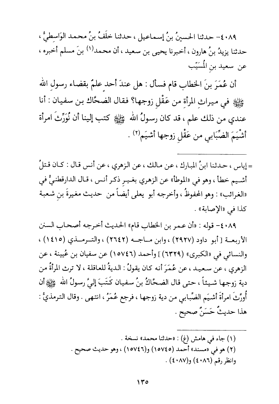 4089 - نا الْحُسَيْنُ بْنُ إِسْمَاعِيلَ , نا خَلَفُ بْنُ مُحَمَّدٍ الْوَاسِطِيُّ , نا يَزِيدُ بْنُ هَارُونَ , أنا يَحْيَى بْنُ سَعِيدٍ , أَنَّ مُحَمَّدَ بْنَ مُسْلِمٍ أَخْبَرَهُ , عَنْ سَعِيدِ بْنِ الْمُسَيِّبِ , أَنَّ عُمَرَ بْنَ الْخَطَّابِ قَامَ فَسَأَلَ: هَلْ عِنْدَ أَحَدٍ عِلْمٌ بِقَضَاءِ رَسُولِ اللَّهِ صَلَّى اللهُ عَلَيْهِ وَسَلَّمَ فِي مِيرَاثِ الْمَرْأَةِ مِنْ عَقْلِ زَوْجِهَا؟ , فَقَالَ الضَّحَّاكُ بْنُ سُفْيَانَ: أَنَا عِنْدِي فِي ذَلِكَ عِلْمٌ قَدْ كَانَ رَسُولُ اللَّهِ صَلَّى اللهُ عَلَيْهِ وَسَلَّمَ «كَتَبَ إِلَيْنَا أَنْ §نُوَرِّثَ امْرَأَةَ أَشْيَمَ الضِّبَابِيِّ مِنْ عَقْلِ زَوْجِهَا أَشْيَمَ». -[136]-