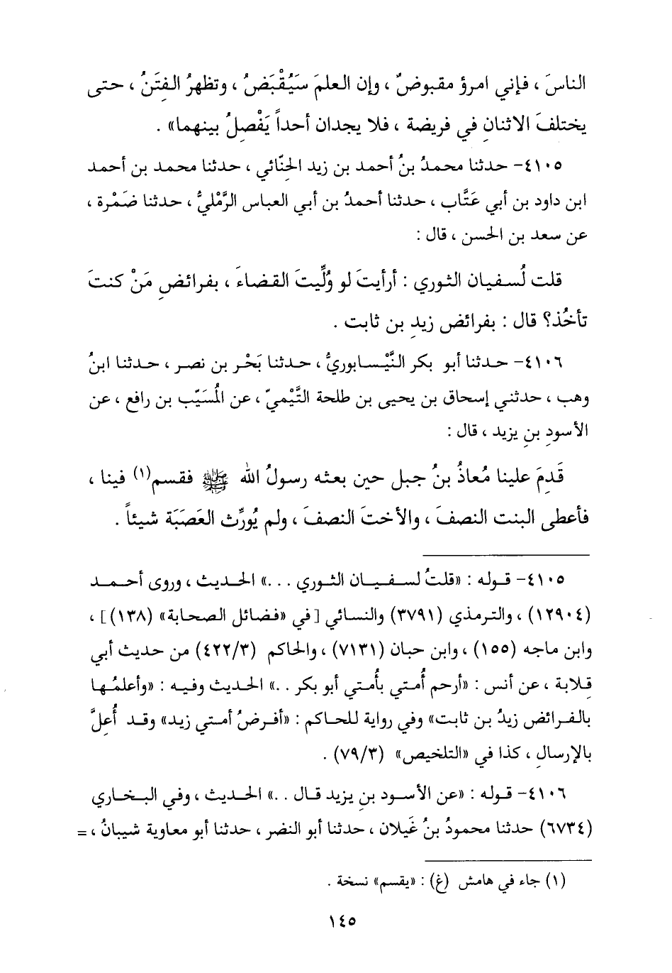 4105 - نا مُحَمَّدُ بْنُ أَحْمَدَ بْنِ زَيْدِ الْجِنَانِيُّ , نا مُحَمَّدُ بْنُ أَحْمَدَ بْنِ دَاوُدَ بْنِ أَبِي عَتَّابٍ , نا أَحْمَدُ بْنُ أَبِي الْعَبَّاسِ الرَّمْلِيُّ , نا ضَمْرَةُ , عَنْ سَعِيدِ بْنِ الْحَسَنِ , قَالَ: قُلْتُ لِسُفْيَانَ الثَّوْرِيِّ: لَوْ وُلِّيتَ الْقَضَاءَ §بِفَرَائِضِ مَنْ كُنْتَ تَأْخُذُ؟ , قَالَ: «بِفَرَائِضِ زَيْدِ بْنِ ثَابِتٍ»