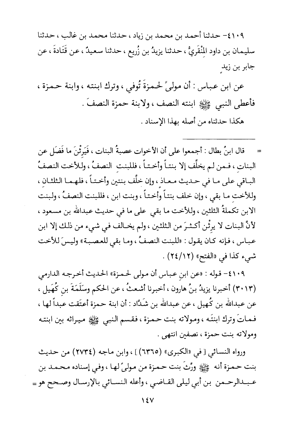 4109 - نا أَحْمَدُ بْنُ مُحَمَّدِ بْنِ زِيَادٍ , نا مُحَمَّدُ بْنُ غَالِبٍ , نا سُلَيْمَانُ بْنُ دَاوُدَ الْمِنْقَرِيُّ , نا يَزِيدُ بْنُ زُرَيْعٍ , نا سَعِيدٌ , عَنْ قَتَادَةَ , عَنْ جَابِرِ بْنِ زَيْدٍ , عَنِ ابْنِ عَبَّاسٍ أَنَّ مَوْلًى لِحَمْزَةَ تُوُفِّيَ فَتَرَكَ ابْنَتَهُ وَابْنَةَ حَمْزَةَ , فَأَعْطَى النَّبِيُّ صَلَّى اللهُ عَلَيْهِ وَسَلَّمَ §ابْنَتَهُ النِّصْفَ , وَلِابْنَةِ حَمْزَةَ النِّصْفُ ". هَكَذَا نَاهُ مِنْ أَصْلِهِ بِهَذَا الْإِسْنَادِ