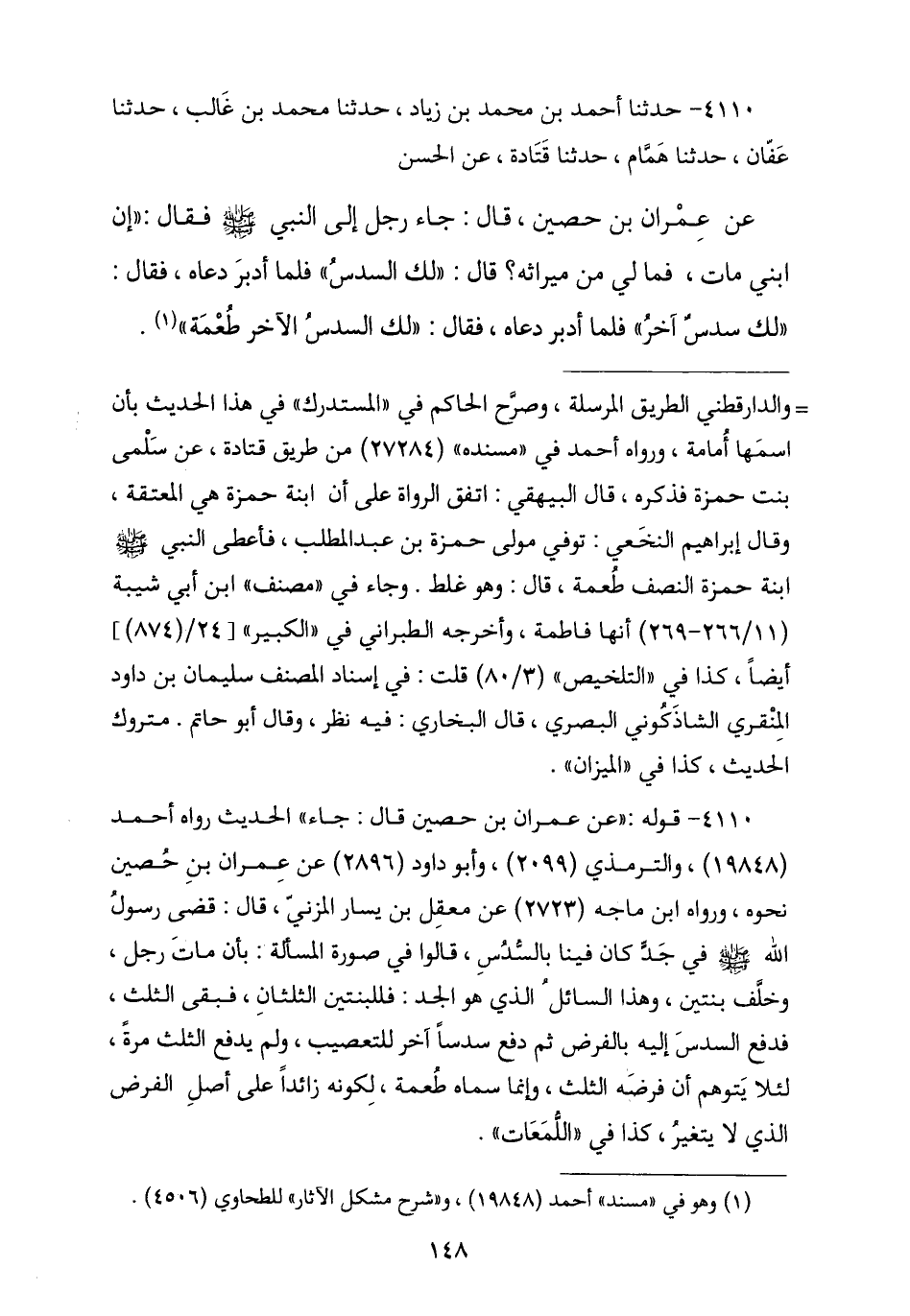 4110 - نا أَحْمَدُ بْنُ مُحَمَّدِ بْنِ زِيَادٍ , نا مُحَمَّدُ بْنُ غَالِبٍ , نا عَفَّانُ , نا هَمَّامٌ , عَنِ الْحَسَنِ , عَنْ عِمْرَانَ بْنِ حُصَيْنٍ , قَالَ: جَاءَ رَجُلٌ النَّبِيَّ صَلَّى اللهُ عَلَيْهِ وَسَلَّمَ فَقَالَ: إِنَّ ابْنَ ابْنِي مَاتَ فَمَا لِي مِنْ مِيرَاثِهِ؟ , قَالَ: «لَكَ السُّدُسُ» , فَلَمَّا أَدْبَرَ دَعَاهُ , فَقَالَ: «لَكَ سُدُسٌ آخَرُ» , فَلَمَّا أَدْبَرَ دَعَاهُ , فَقَالَ: § «لَكَ السُّدُسُ الْآخَرُ طُعْمَةً»