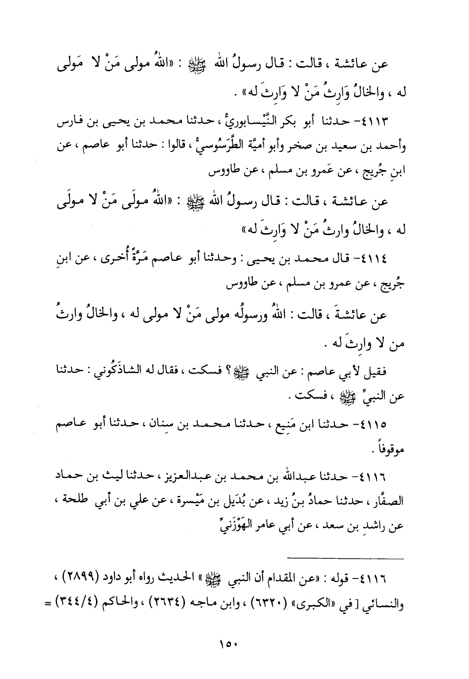 4114 - قَالَ مُحَمَّدُ بْنُ يَحْيَى , وَنا أَبُو عَاصِمٍ , مَرَّةً أُخْرَى عَنِ ابْنِ جُرَيْجٍ , عَنْ عَمْرِو بْنِ مُسْلِمٍ , عَنْ طَاوُسٍ , عَنْ عَائِشَةَ , قَالَتْ: § «اللَّهُ وَرَسُولُهُ مَوْلَى مَنْ لَا مَوْلَى لَهُ , وَالْخَالُ وَارِثُ مَنْ لَا وَارِثَ لَهُ». فَقِيلَ لِأَبِي عَاصِمٍ: عَنِ النَّبِيِّ صَلَّى اللهُ عَلَيْهِ وَسَلَّمَ؟ , فَسَكَتَ فَقَالَ لَهُ الشَّاذَكُونِيُّ: حَدِّثْنَا عَنِ النَّبِي صَلَّى اللهُ عَلَيْهِ وَسَلَّمَ , فَسَكَتَ.