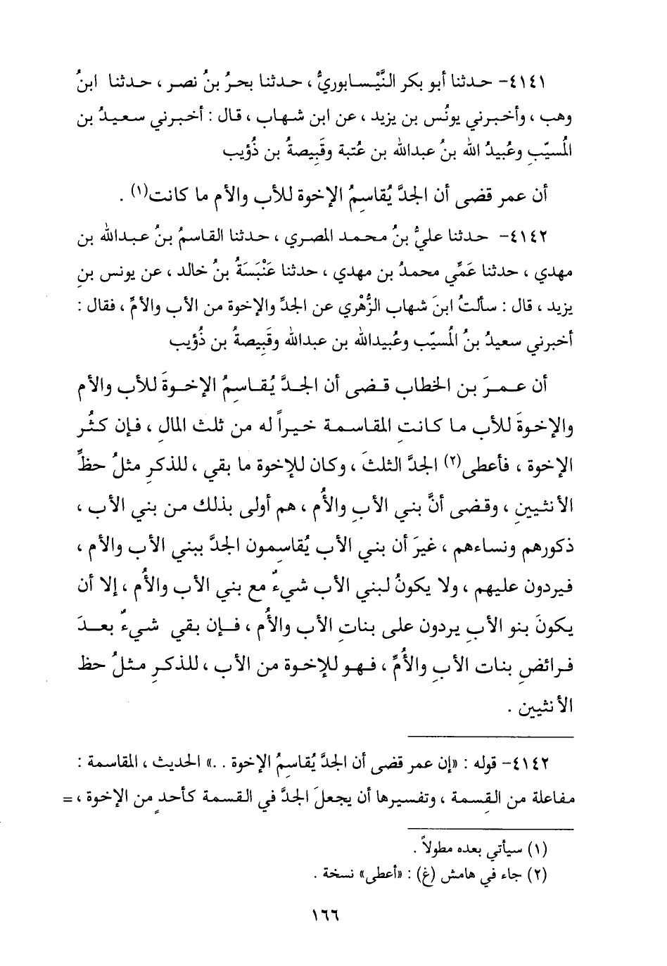 4141 - نا أَبُو بَكْرٍ النَّيْسَابُورِيُّ , نا بَحْرُ بْنُ نَصْرٍ , نا ابْنُ وَهْبٍ , قَالَ: وَأَخْبَرَنِي يُونُسُ بْنُ يَزِيدَ , عَنِ ابْنِ شِهَابٍ , أَخْبَرَنِي سَعِيدُ بْنُ الْمُسَيِّبِ , وَعُبَيْدُ اللَّهِ بْنُ عَبْدِ اللَّهِ بْنِ عُتْبَةَ , وَقَبِيصَةُ بْنُ ذُؤَيْبٍ , أَنَّ عُمَرَ قَضَى " أَنَّ §الْجَدَّ يُقَاسِمُ الْإِخْوَةَ لِلْأَبِ وَالْأُمِّ مَا كَانَتْ