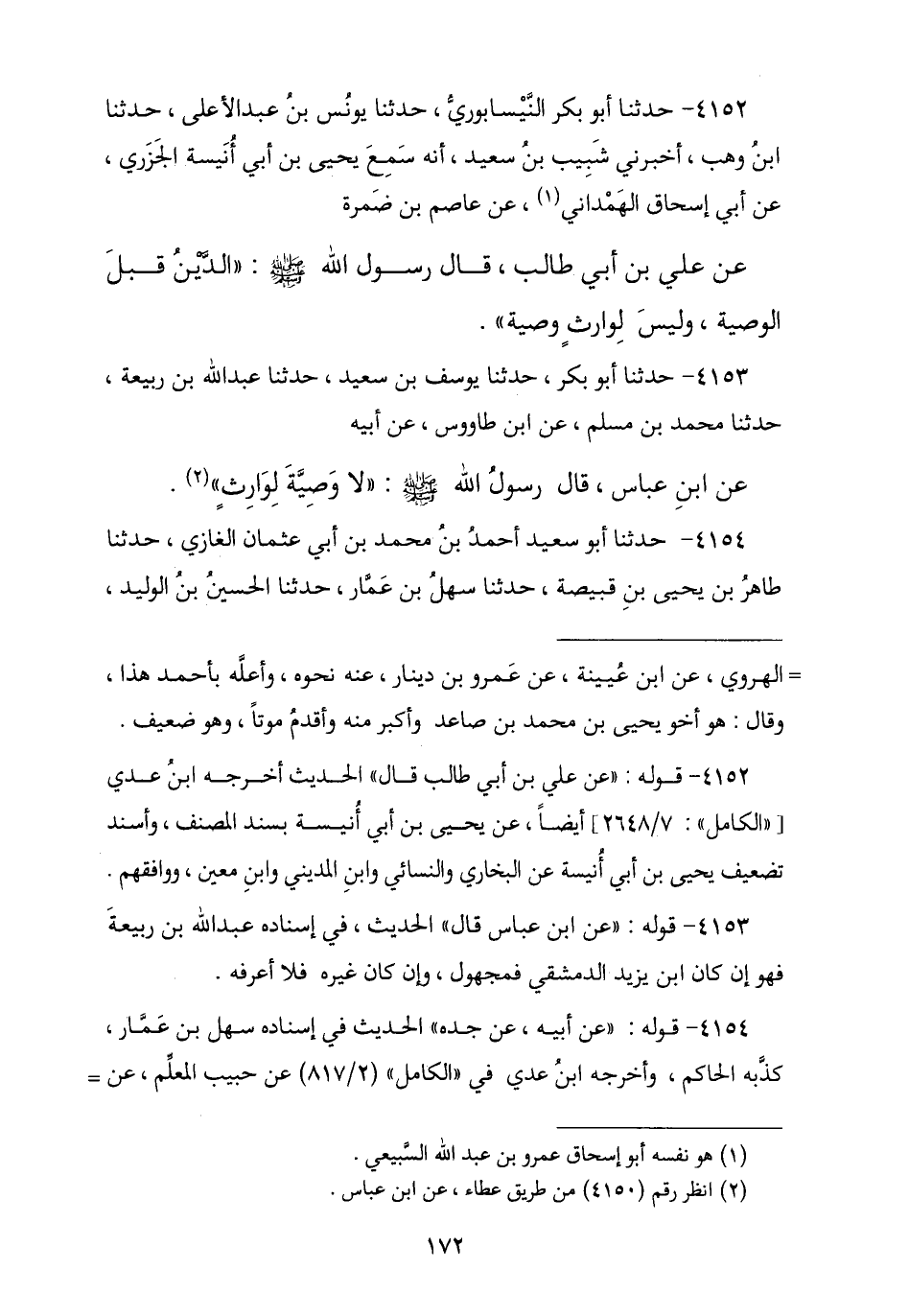 4152 - نا أَبُو بَكْرٍ النَّيْسَابُورِيُّ , نا يُونُسُ بْنُ عَبْدِ الْأَعْلَى , نا ابْنُ وَهْبٍ , أَخْبَرَنِي شَبِيبُ بْنُ سَعِيدٍ , أَنَّهُ سَمِعَ يَحْيَى بْنَ أَبِي أُنَيْسَةَ الْجَزَرِيَّ , عَنْ أَبِي إِسْحَاقَ الْهَمْدَانِيِّ , عَنْ عَاصِمِ بْنِ ضَمْرَةَ , عَنْ عَلِيِّ بْنِ أَبِي طَالِبٍ , قَالَ: قَالَ رَسُولُ اللَّهِ صَلَّى اللهُ عَلَيْهِ وَسَلَّمَ: § «الدَّيْنُ قَبْلَ الْوَصِيَّةِ وَلَيْسَ لِوَارِثٍ وَصِيَّةٌ»