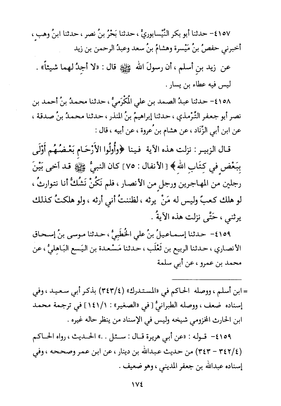 4158 - نا عَبْدُ الصَّمَدِ بْنُ عَلِيٍّ الْمُكْرِمِيُّ , نا مُحَمَّدُ بْنُ أَحْمَدَ بْنِ نَصْرٍ أَبُو جَعْفَرٍ التِّرْمِذِيُّ , نا إِبْرَاهِيمُ بْنُ الْمُنْذِرِ , نا مُحَمَّدُ بْنُ صَدَقَةَ , عَنِ ابْنِ أَبِي الزِّنَادِ , عَنْ هِشَامِ بْنِ عُرْوَةَ , عَنْ أَبِيهِ , قَالَ: قَالَ الزُّبَيْرُ: " نَزَلَتْ هَذِهِ الْآيَةُ فِينَا {وَأُولُو الْأَرْحَامِ بَعْضُهُمْ أَوْلَى بِبَعْضٍ فِي كِتَابِ اللَّهِ} [الأحزاب: 6] , كَانَ النَّبِيُّ صَلَّى اللهُ عَلَيْهِ وَسَلَّمَ قَدْ §آخَى بَيْنَ رَجُلَيْنِ مِنَ الْمُهَاجِرِينَ وَرَجُلٍ مِنَ الْأَنْصَارِ , فَلَمْ نَكُنْ نَشُكُّ أَنَّا نَتَوَارَثُ لَوْ هَلَكَ كَعْبٌ وَلَيْسَ لَهُ مَنْ يَرِثُهُ لَظَنَنْتُ أَنِّي أَرِثُهُ , وَلَوْ هَلَكْتُ كَذَلِكَ يَرِثُنِي حَتَّى نَزَلَتْ هَذِهِ الْآيَةُ "
