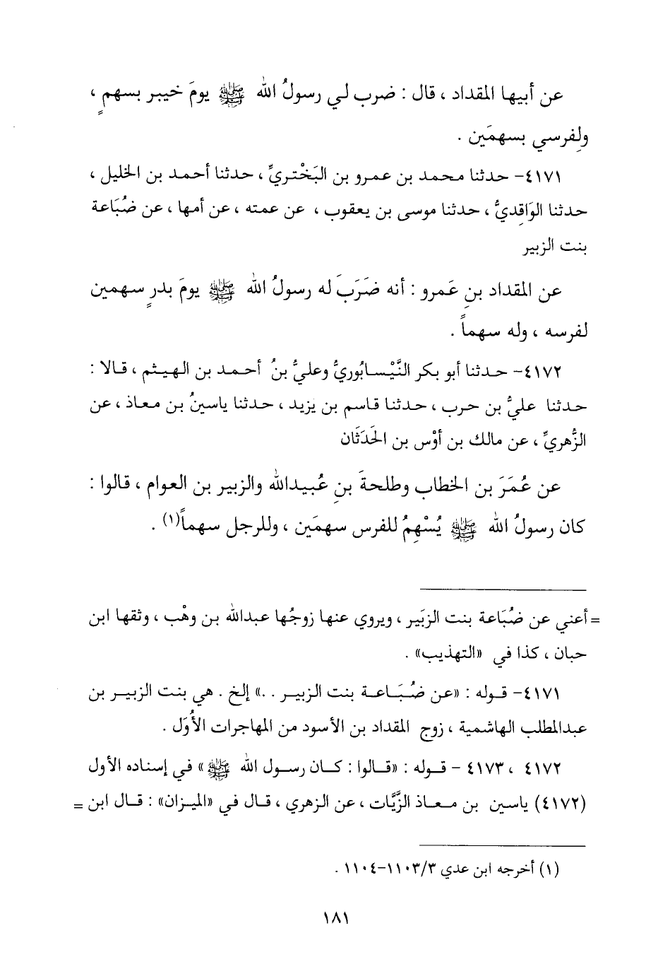 4171 - نا مُحَمَّدُ بْنُ عَمْرِو بْنِ الْبَخْتَرِيِّ , نا أَحْمَدُ بْنُ الْخَلِيلِ , نا الْوَاقِدِيُّ , نا مُوسَى بْنُ يَعْقُوبَ , عَنْ عَمَّتِهِ , عَنْ أُمِّهَا , عَنْ ضُبَاعَةَ بِنْتِ الزُّبَيْرِ , عَنِ الْمِقْدَادِ بْنِ عَمْرٍو , «أَنَّهُ ضَرَبَ لَهُ رَسُولُ اللَّهِ صَلَّى اللهُ عَلَيْهِ وَسَلَّمَ يَوْمَ بَدْرٍ §سَهْمَيْنِ لِفَرَسِهِ وَلَهُ سَهْمًا»