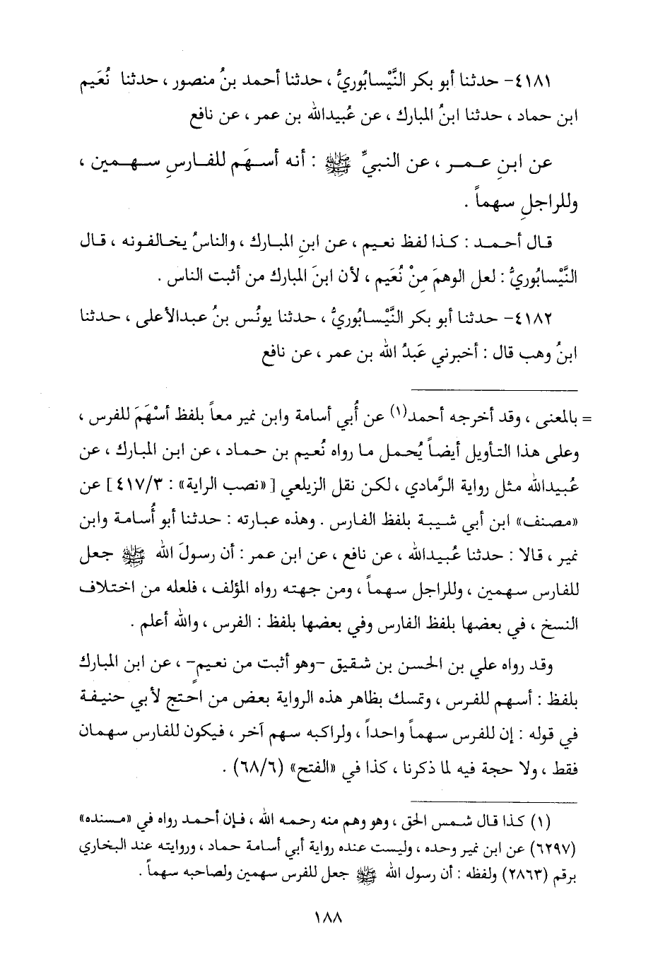 4181 - حَدَّثَنَا أَبُو بَكْرٍ النَّيْسَابُورِيُّ , نا أَحْمَدُ بْنُ مَنْصُورٍ , نا نُعَيْمُ بْنُ حَمَّادٍ , نا ابْنُ الْمُبَارَكِ , عَنْ عُبَيْدِ اللَّهِ بْنِ عُمَرَ , عَنْ نَافِعٍ , عَنِ ابْنِ عُمَرَ , عَنِ النَّبِيِّ صَلَّى اللهُ عَلَيْهِ وَسَلَّمَ «أَنَّهُ §أَسْهَمَ لِلْفَارِسِ سَهْمَيْنِ , وَلِلرَّاجِلِ سَهْمًا». قَالَ أَحْمَدُ: كَذَا لَفْظُ نُعَيْمٍ , عَنِ ابْنِ الْمُبَارَكِ وَالنَّاسُ يُخَالِفُونَهُ. قَالَ النَّيْسَابُورِيُّ: وَلَعَلَّ الْوَهْمَ مِنْ نُعَيْمٍ , لِأَنَّ ابْنَ الْمُبَارَكِ مِنْ أَثْبَتِ النَّاسِ