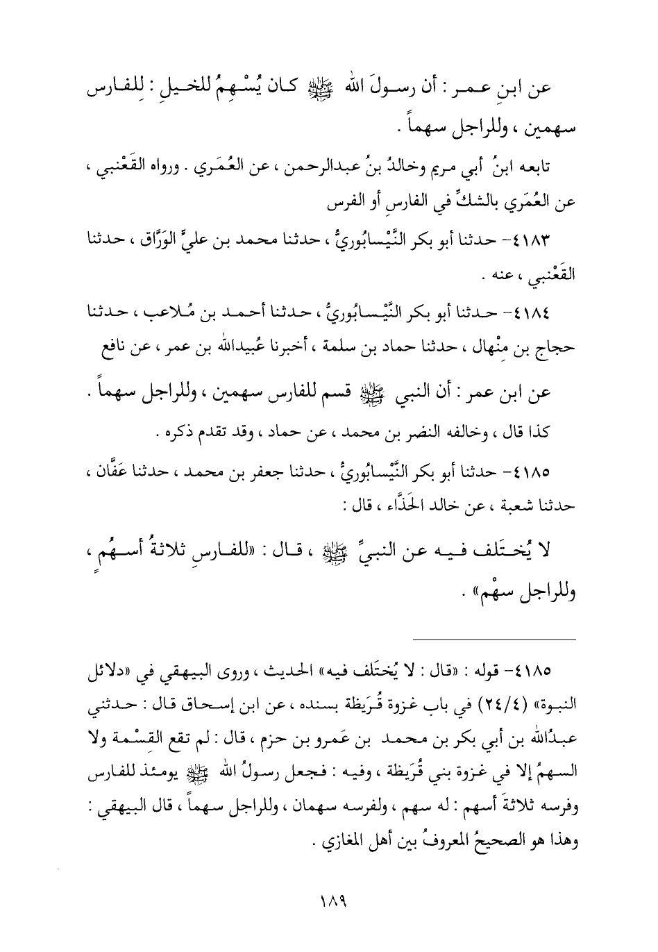 4184 - حَدَّثَنَا أَبُو بَكْرٍ النَّيْسَابُورِيُّ , نا أَحْمَدُ بْنُ مُلَاعِبٍ , نا حَجَّاجُ بْنُ مِنْهَالٍ , نا حَمَّادُ بْنُ سَلَمَةَ , أنا عُبَيْدُ اللَّهِ بْنُ عُمَرَ , عَنْ نَافِعٍ , عَنِ ابْنِ عُمَرَ , أَنَّ النَّبِيَّ صَلَّى اللهُ عَلَيْهِ وَسَلَّمَ § «قَسَمَ لِلْفَارِسِ سَهْمَيْنِ , وَلِلرَّاجِلِ سَهْمًا». كَذَا قَالَ , وَخَالَفَهُ النَّضْرُ بْنُ مُحَمَّدٍ , عَنْ حَمَّادٍ , وَقَدْ تَقَدَّمَ ذِكْرُهُ