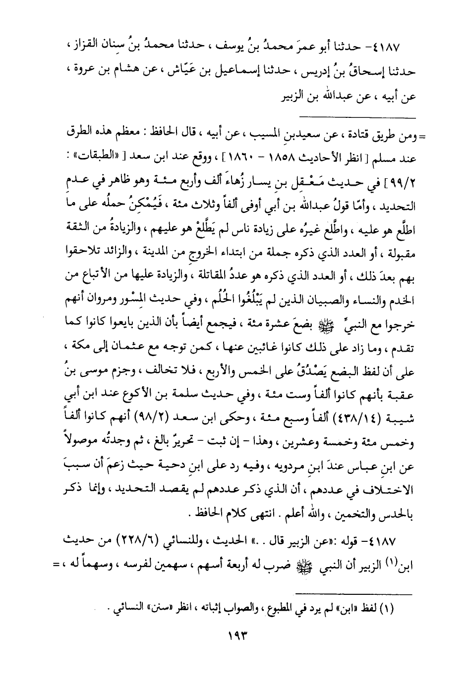 4187 - حَدَّثَنَا أَبُو عُمَرَ مُحَمَّدُ بْنُ يُوسُفَ , نا مُحَمَّدُ بْنُ سِنَانٍ الْقَزَّازُ , نا إِسْحَاقُ بْنُ إِدْرِيسَ , نا إِسْمَاعِيلُ بْنُ عَيَّاشٍ , عَنْ هِشَامِ بْنِ عُرْوَةَ , عَنْ أَبِيهِ , عَنْ عَبْدِ اللَّهِ بْنِ الزُّبَيْرِ , -[194]- عَنِ الزُّبَيْرِ , قَالَ: «أَعْطَانِي رَسُولُ اللَّهِ صَلَّى اللهُ عَلَيْهِ وَسَلَّمَ يَوْمَ بَدْرٍ أَرْبَعَةَ أَسْهُمٍ §سَهْمَيْنِ لِفَرَسِي وَسَهْمًا لِي , وَسَهْمًا لِأُمِّي مِنْ ذَوِي الْقُرْبَى». خَالَفَهُ هَيْثَمُ بْنُ خَارِجَةَ فِي إِسْنَادِهِ