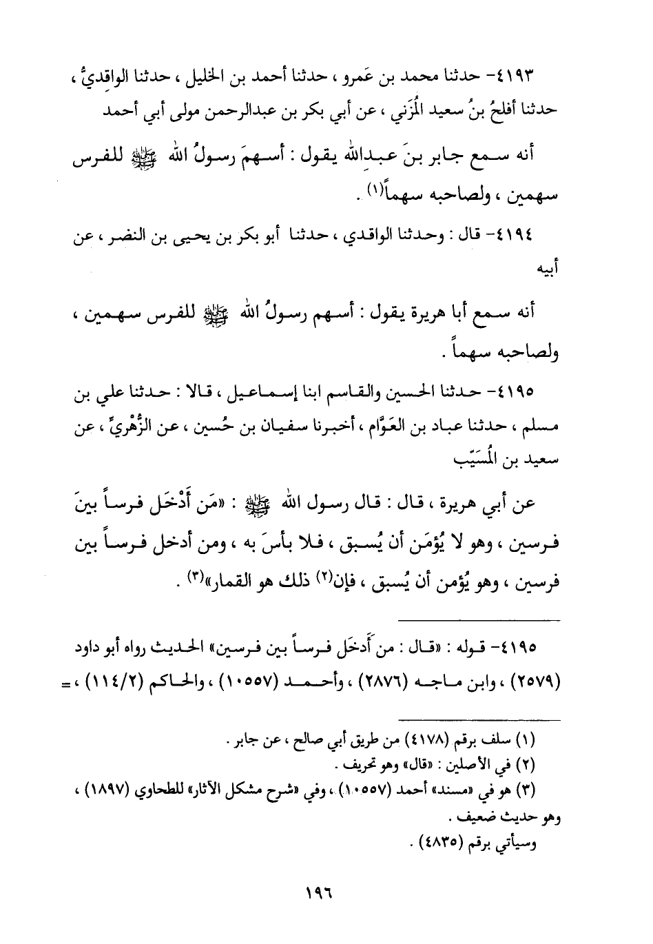 4194 - قَالَ: وَنا الْوَاقِدِيُّ , نا أَبُو بَكْرِ بْنُ يَحْيَى بْنِ النَّضْرِ , عَنْ أَبِيهِ , أَنَّهُ سَمِعَ أَبَا هُرَيْرَةَ , يَقُولُ: «أَسْهَمَ رَسُولُ اللَّهِ صَلَّى اللهُ عَلَيْهِ وَسَلَّمَ §لِلْفَرَسِ سَهْمَيْنِ , وَلِصَاحِبِهِ سَهْمًا»
