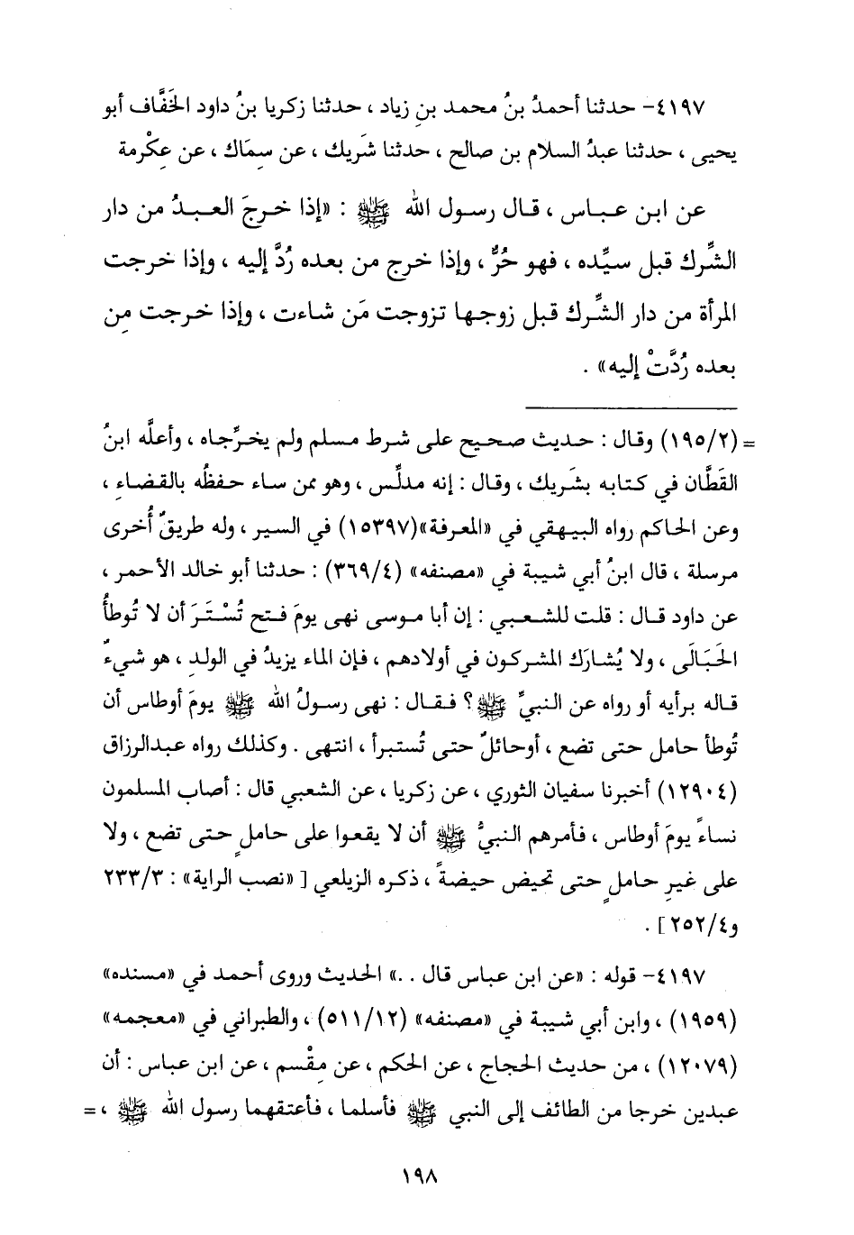 4197 - حَدَّثَنَا أَحْمَدُ بْنُ مُحَمَّدِ بْنِ زِيَادٍ , نا زَكَرِيَّا بْنُ دَاوُدَ الْخَفَّافُ أَبُو يَحْيَى , نا عَبْدُ السَّلَامِ بْنُ صَالِحٍ , نا شَرِيكٌ , عَنْ سِمَاكٍ , عَنْ عِكْرِمَةَ , عَنِ ابْنِ عَبَّاسٍ , قَالَ: قَالَ رَسُولُ اللَّهِ صَلَّى اللهُ عَلَيْهِ وَسَلَّمَ: § «إِذَا خَرَجَ الْعَبْدُ مِنْ دَارِ الشِّرْكِ قَبْلَ سَيِّدِهِ فَهُوَ حُرٌّ وَإِذَا خَرَجَ مِنْ بَعْدِهِ رُدَّ إِلَيْهِ , وَإِذَا خَرَجَتِ الْمَرْأَةُ مِنْ دَارِ الشِّرْكِ قَبْلَ زَوْجِهَا تَزَوَّجَتْ مَنْ شَاءَتْ وَإِذَا خَرَجَتْ مِنْ بَعْدِهِ رُدَّتْ إِلَيْهِ»