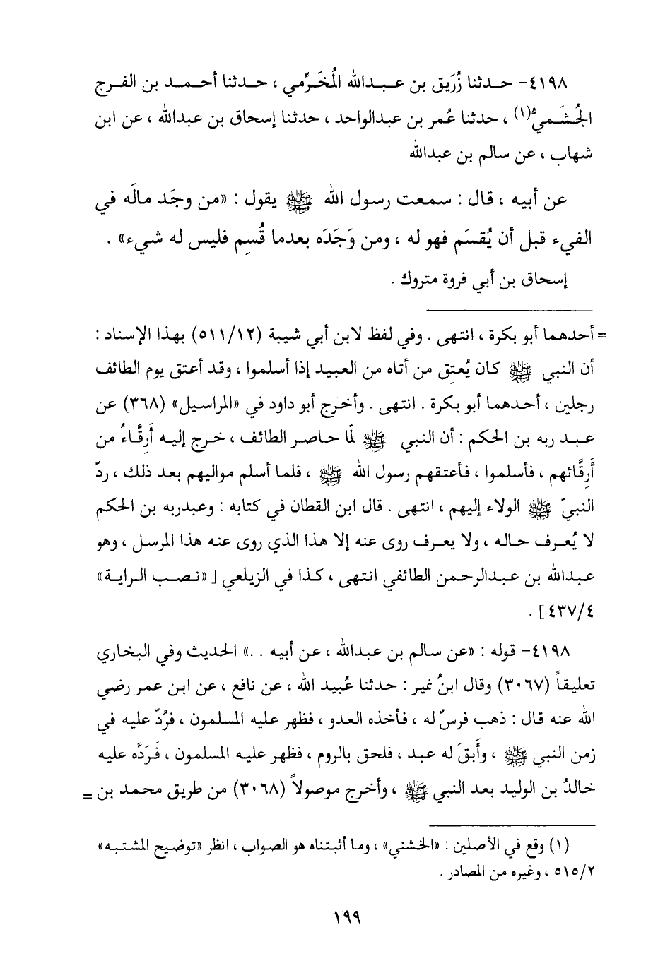 4198 - حَدَّثَنَا رُزَيْقُ بْنُ عَبْدِ اللَّهِ الْمَخْرَمِيُّ , نا أَحْمَدُ بْنُ الْفَرَجِ الْجُشَمِيُّ , نا عُمَرُ بْنُ عَبْدِ الْوَاحِدِ , نا إِسْحَاقُ بْنُ عَبْدِ اللَّهِ , عَنِ ابْنِ شِهَابٍ , عَنْ سَالِمِ بْنِ عَبْدِ اللَّهِ , عَنْ أَبِيهِ , قَالَ: سَمِعْتُ رَسُولَ اللَّهِ صَلَّى اللهُ عَلَيْهِ وَسَلَّمَ , يَقُولُ: § «مَنْ وَجَدَ مَالَهُ فِي الْفَيْءِ قَبْلَ أَنْ يُقْسَمَ فَهُوَ لَهُ , وَمَنْ وَجَدَهُ بَعْدَمَا قُسِمَ فَلَيْسَ لَهُ شَيْءٌ». إِسْحَاقُ هُوَ ابْنُ أَبِي فَرْوَةَ مَتْرُوكٌ