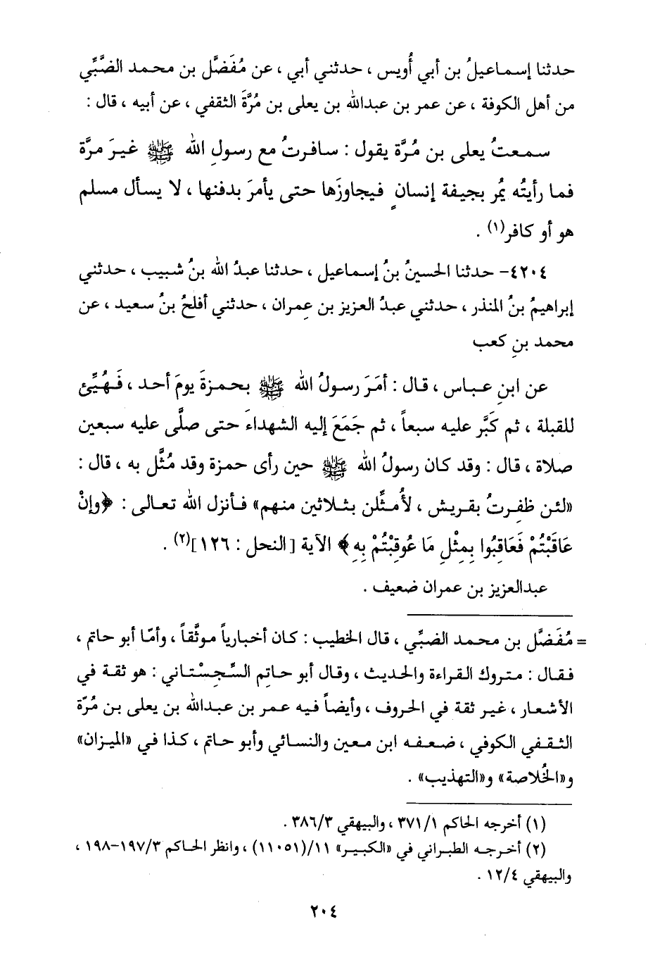 4204 - حَدَّثَنَا الْحُسَيْنُ بْنُ إِسْمَاعِيلَ , نا عَبْدُ اللَّهِ بْنُ شَبِيبٍ , حَدَّثَنِي إِبْرَاهِيمُ بْنُ الْمُنْذِرِ , حَدَّثَنِي عَبْدُ الْعَزِيزِ بْنُ عِمْرَانَ , حَدَّثَنِي أَفْلَحُ بْنُ سَعِيدٍ , عَنْ مُحَمَّدِ بْنِ كَعْبٍ , عَنِ ابْنِ عَبَّاسٍ , قَالَ: أَمَرَ رَسُولُ اللَّهِ صَلَّى اللهُ عَلَيْهِ وَسَلَّمَ لِحَمْزَةَ يَوْمَ أُحُدٍ فَهُيِّئَ لِلْقِبْلَةِ ثُمَّ كَبَّرَ عَلَيْهِ سَبْعًا ثُمَّ جَمَعَ إِلَيْهِ الشُّهَدَاءَ حَتَّى صَلَّى عَلَيْهِ سَبْعِينَ صَلَاةً , قَالَ: قَالَ وَقَدْ كَانَ رَسُولُ اللَّهِ صَلَّى اللهُ عَلَيْهِ وَسَلَّمَ حِينَ رَأَى حَمْزَةَ وَقَدْ مُثِّلَ بِهِ , قَالَ: § «لَئِنْ ظَفَرْتُ بِقُرَيْشٍ لَأُمَثِّلَنَّ بِثَلَاثِينَ مِنْهُمْ» فَأَنْزَلَ اللَّهُ تَعَالَى {وَإِنْ عَاقَبْتُمْ فَعَاقِبُوا بِمِثْلِ مَا عُوقِبْتُمْ بِهِ} [النحل: 126] الْآيَةَ. عَبْدُ الْعَزِيزِ بْنُ عِمْرَانَ ضَعِيفٌ